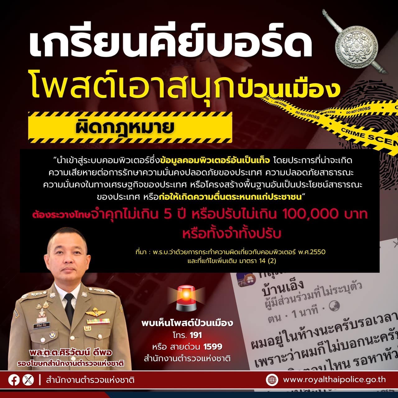 สำนักงานตำรวจแห่งชาติ เตือนโพสต์เอาสนุก หวังป่วนเมือง โทษหนัก จำคุก 5 ปี ปรับ 100,000 บาท