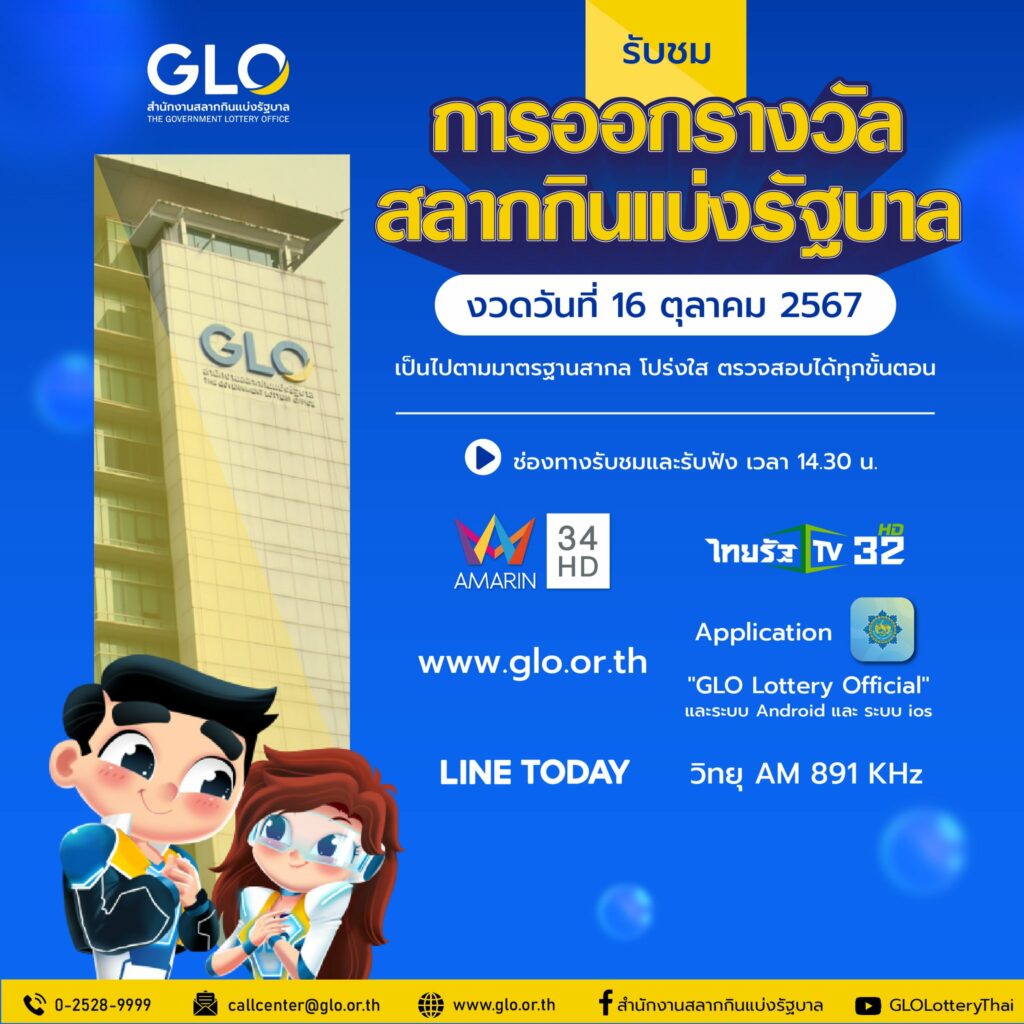 สำนักงานสลากกินแบ่งรัฐบาล ขอเชิญชมการออกรางวัลสลากกินแบ่งรัฐบาล งวดวันที่ 16 ตุลาคม 2567