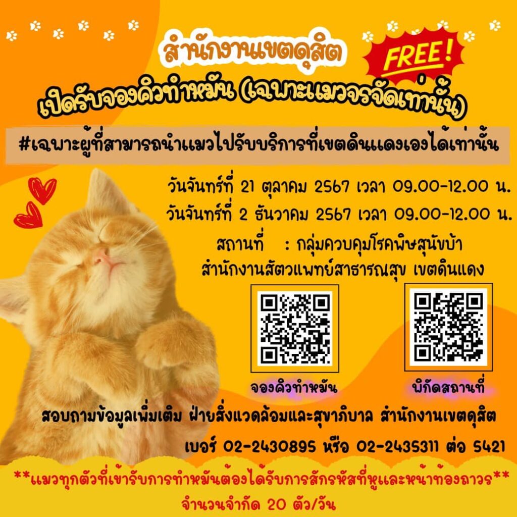 สำนักงานเขตดุสิต เปิดรับจองคิวทำหมันฟรี เฉพาะแมวจรจัดเท่านั้น สามารถจองคิวได้ที่ สแกน QR CODE ในรูป