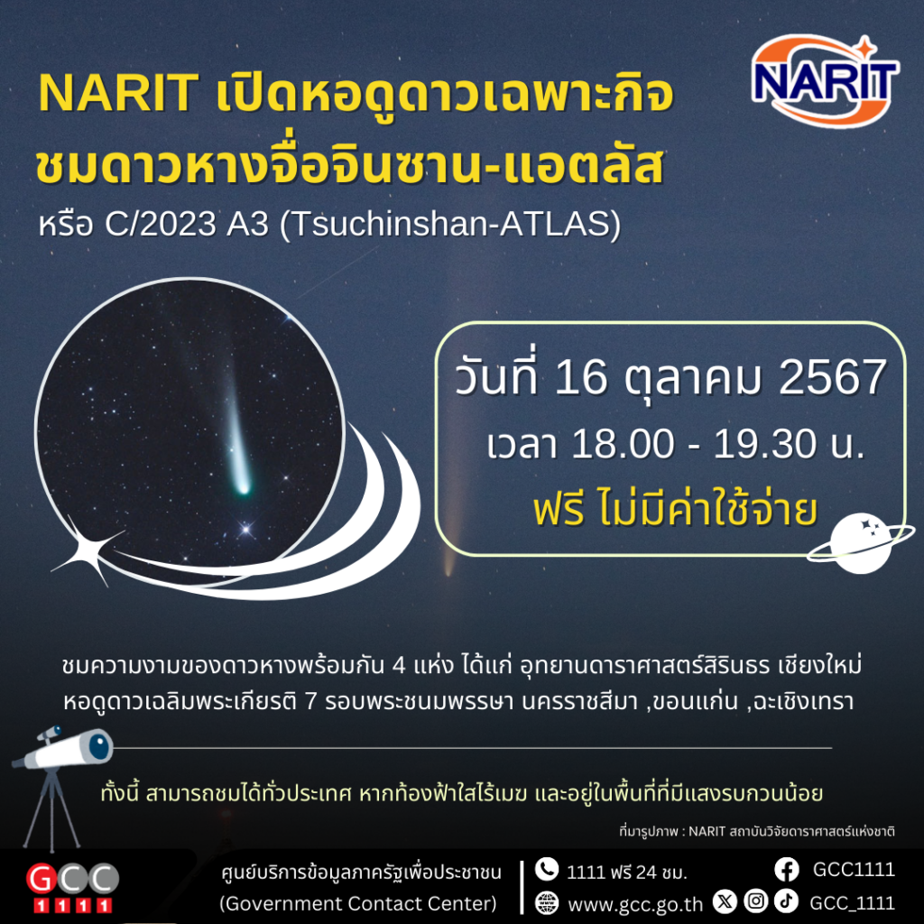 NARIT เปิดหอดูดาวชมดาวหางจื่อจินซาน-แอตลัส หรือ C/2023 A3 (Tsuchinshan-ATLAS) ในวันที่ 16 ตุลาคม 2567 ตั้งแต่เวลา 18.00-19.30 น. (ฟรี ไม่มีค่าใช้จ่าย)