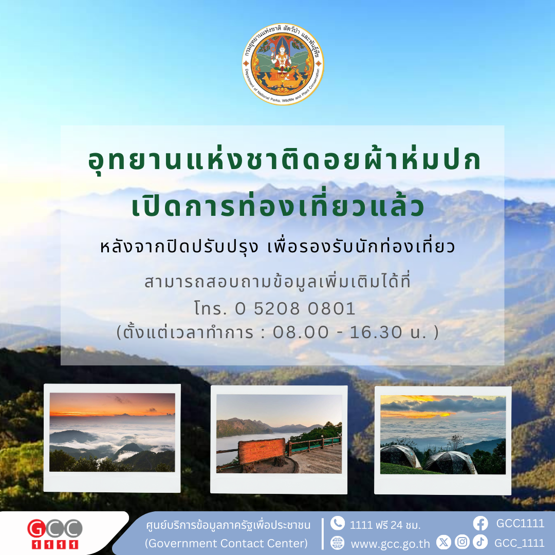 กรมอุทยานแห่งชาติ​ สัตว์ป่า​ และพันธุ์พืช แจ้งอุทยานแห่งชาติดอยผ้าห่มปก เปิดการท่องเที่ยวแล้ว ตั้งแต่บัดนี้เป็นต้นไป หลังจากปิดปรับปรุง เพื่อรองรับนักท่องเที่ยว