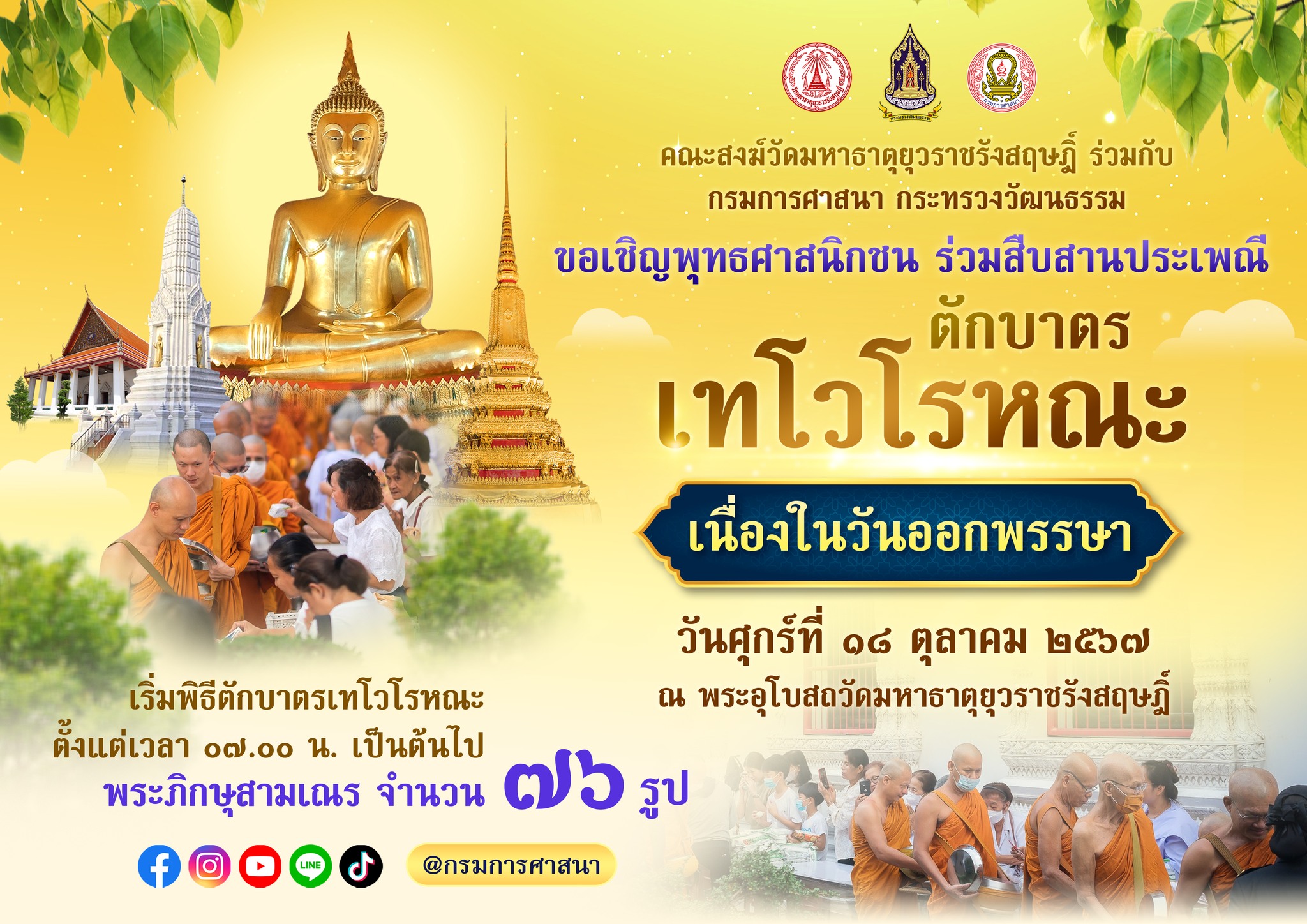 กรมการศาสนา ขอเชิญชวนพุทธศาสนิกชน ร่วมสืบสานประเพณี ตักบาตรเทโวโรหณะ พระสงฆ์ 79 รูป เนื่องในวันออกพรรษา วันที่ 18 ตุลาคม 2567 เวลา 07.00 น. เป็นต้นไป ณ พระอุโบสถวัดมหาธาตุยุวราชรังสฤษฎิ์กรุงเทพมหานคร