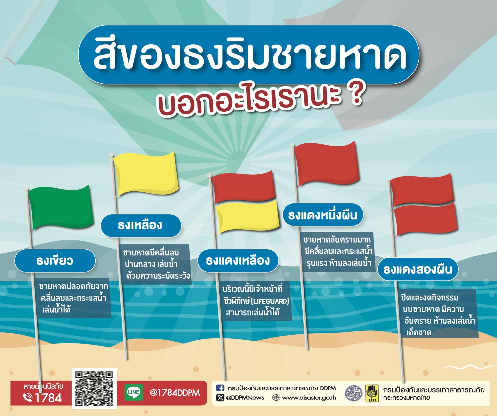 กรมป้องกันและบรรเทาสาธารณภัย แจ้งเตือนเล่นน้ำทะเลช่วงหน้ามรสุมเสี่ยงจมน้ำ โดยสังเกตธงสัญลักษณ์คำเตือนในการลงเล่นน้ำทะเลที่ปักไว้บริเวณชายหาด ซึ่งธงต่างๆ มีความหมาย ดังนี้ ธงแดง 2 ผืน หมายถึงปิดและงดทำกิจกรรม เนื่องจากมีความอันตรายมาก ห้ามลงเล่นน้ำเด็ดขาด, ธงแดง 1 ผืน หมายถึง อันตราย ห้ามลงเล่นน้ำ, ธงเหลือง หมายถึง ให้เล่นน้ำด้วยความระมัดระวัง, ธงแดง-เหลือง หมายถึง บริเวณนี้มีเจ้าหน้าที่ชีวพิทักษ์ (Lifeguard) สามารถเล่นน้ำได้, ธงเขียว ชายหาดปลอดภัยจากคลื่นลมและกระแสน้ำเล่นน้ำได้
