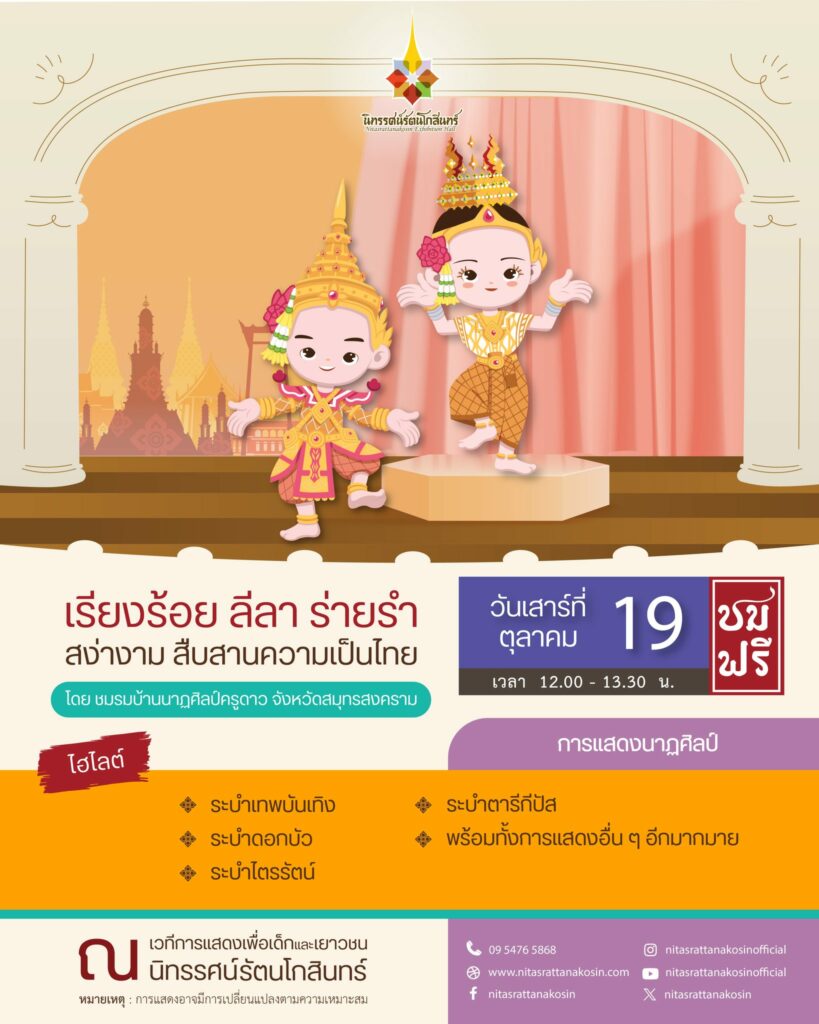 นิทรรศน์รัตนโกสินทร์ จัดเวทีการแสดงเพื่อเด็กและเยาวชน ภูมิใจนำเสนอการแสดงนาฏศิลป์ ที่เรียงร้อย ลีลา ร่ายรำ สง่างาม สืบสานความเป็นไทย โดย ชมรมบ้านนาฏศิลป์ครูดาว จังหวัดสมุทรสงคราม วันเสาร์ที่ 19 ตุลาคม 2567 ชมฟรี ทุกวันเสาร์ – อาทิตย์ เวลา 12.00 – 13.30 น. ณ เวทีการแสดงเพื่อเด็กและเยาวชน นิทรรศน์รัตนโกสินทร์