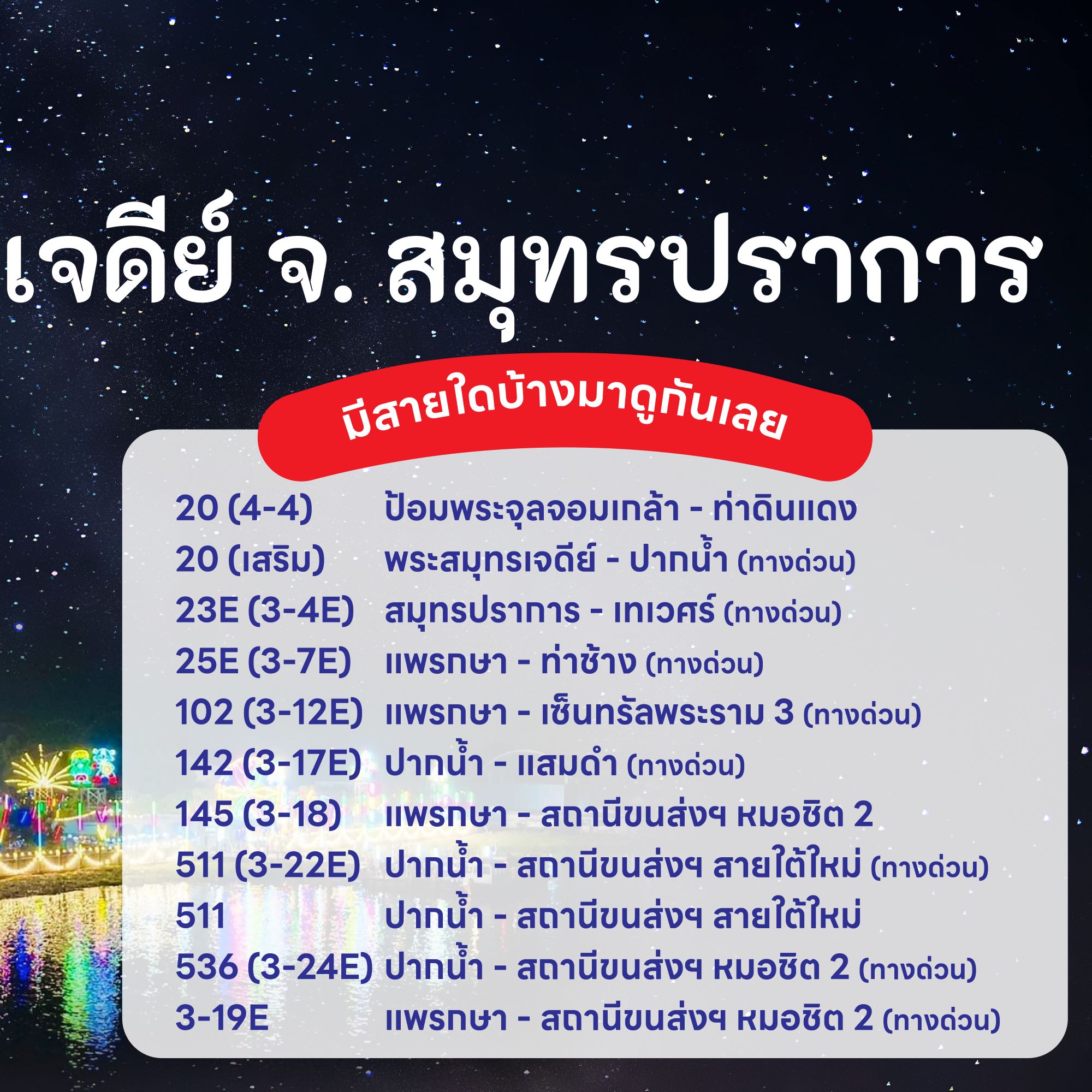 เนื่องด้วย จังหวัดสมุทรปราการ มีการจัดงานนมัสการองค์พระสมุทรเจดีย์ เป็นประเพณีที่จัดขึ้นเป็นประจำทุกปี ซึ่งในปี 2567 กำหนดจัดงานระหว่างวันที่ 22 ตุลาคม 2567 – 2 พฤศจิกายน 2567 บริเวณสนามหน้าศาลากลางจังหวัดสมุทรปราการ ตลาดปากน้ำฝั่ง อำเภอเมืองสมุทรปราการ และบริเวณองค์พระสมุทรเจดีย์ ฝั่งอำเภอพระสมุทรเจดีย์ โดยมีรถโดยสารประจำทางของ ขสมก. ให้บริการผ่านสถานที่จัดงานทั้ง 2 ฝั่ง ดังนี้