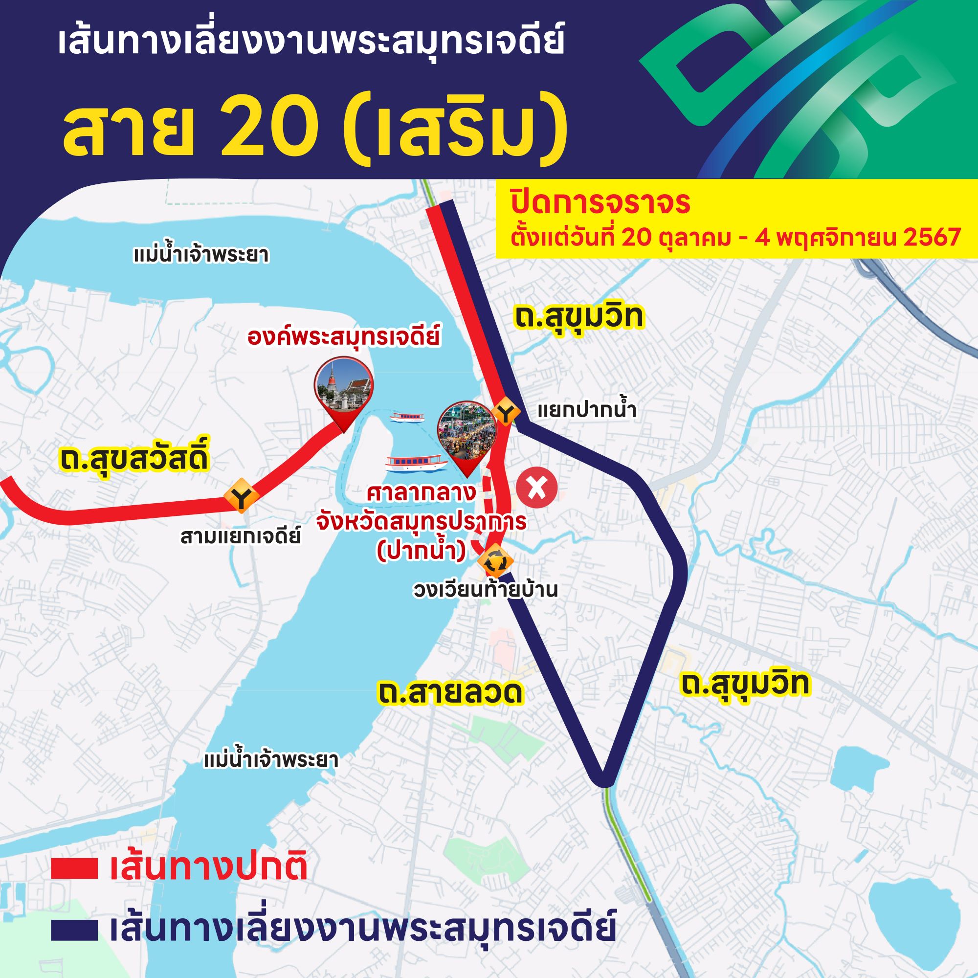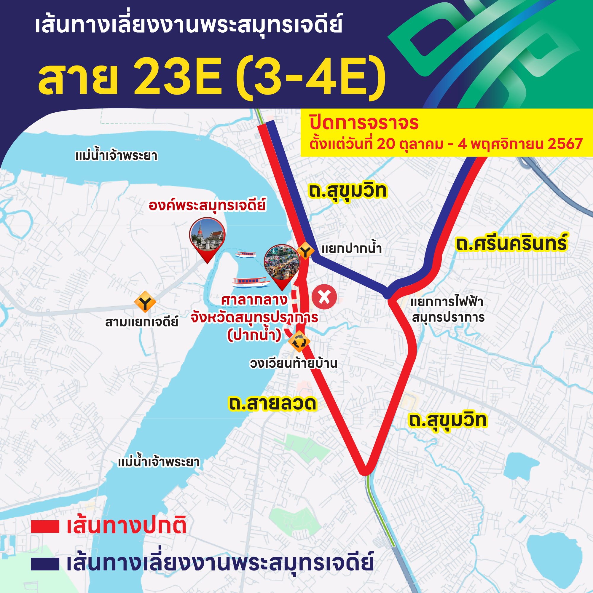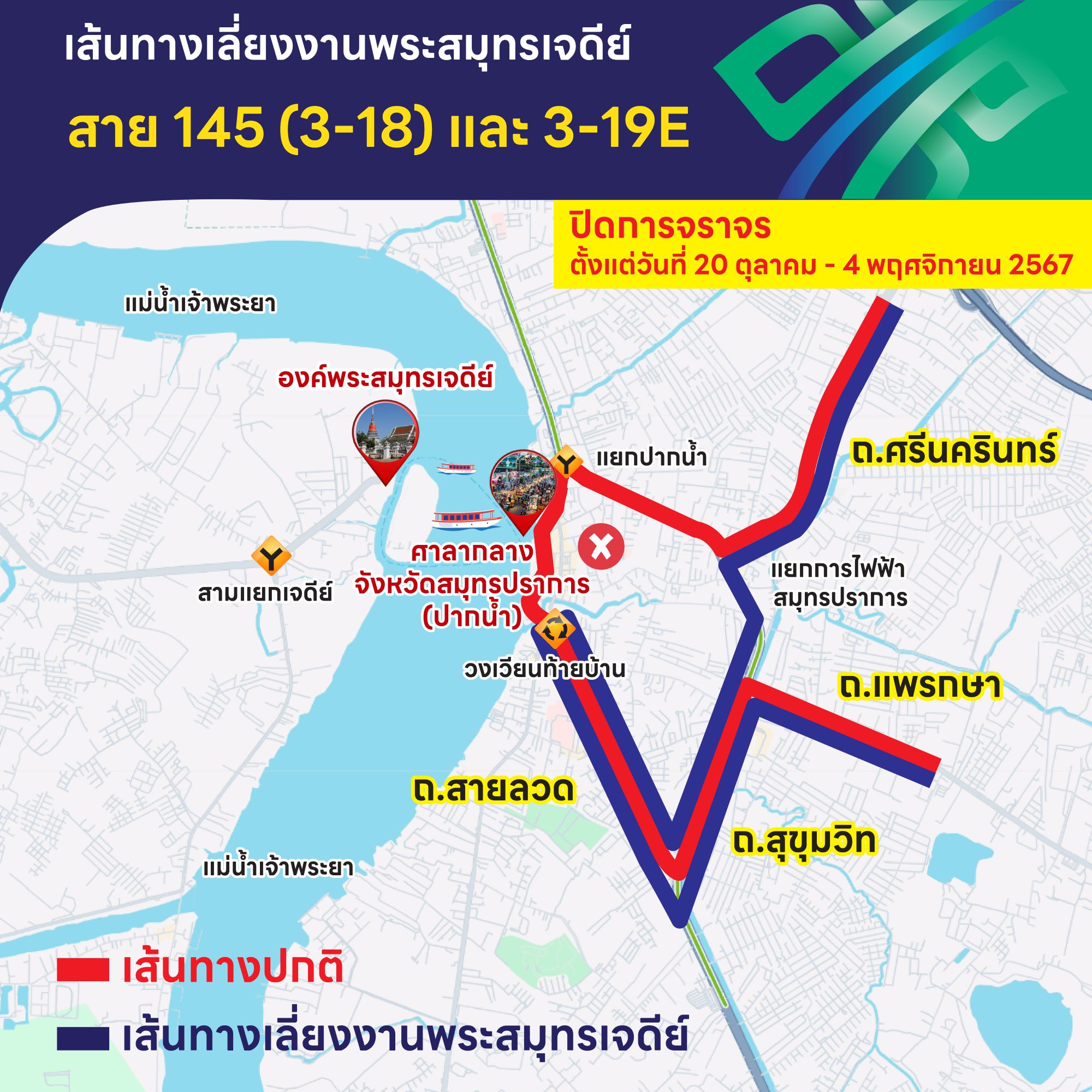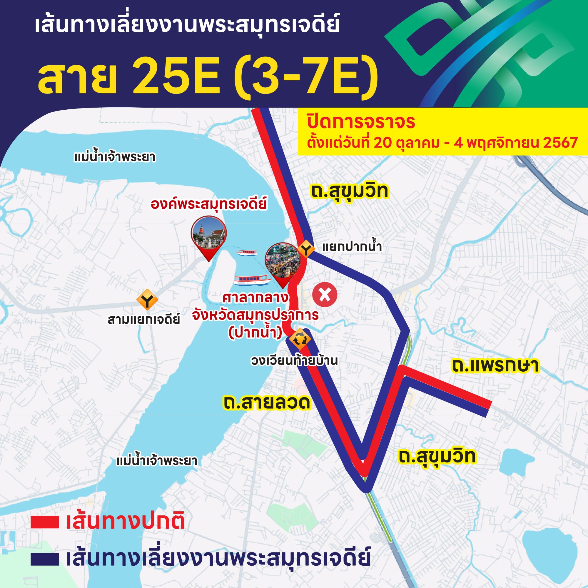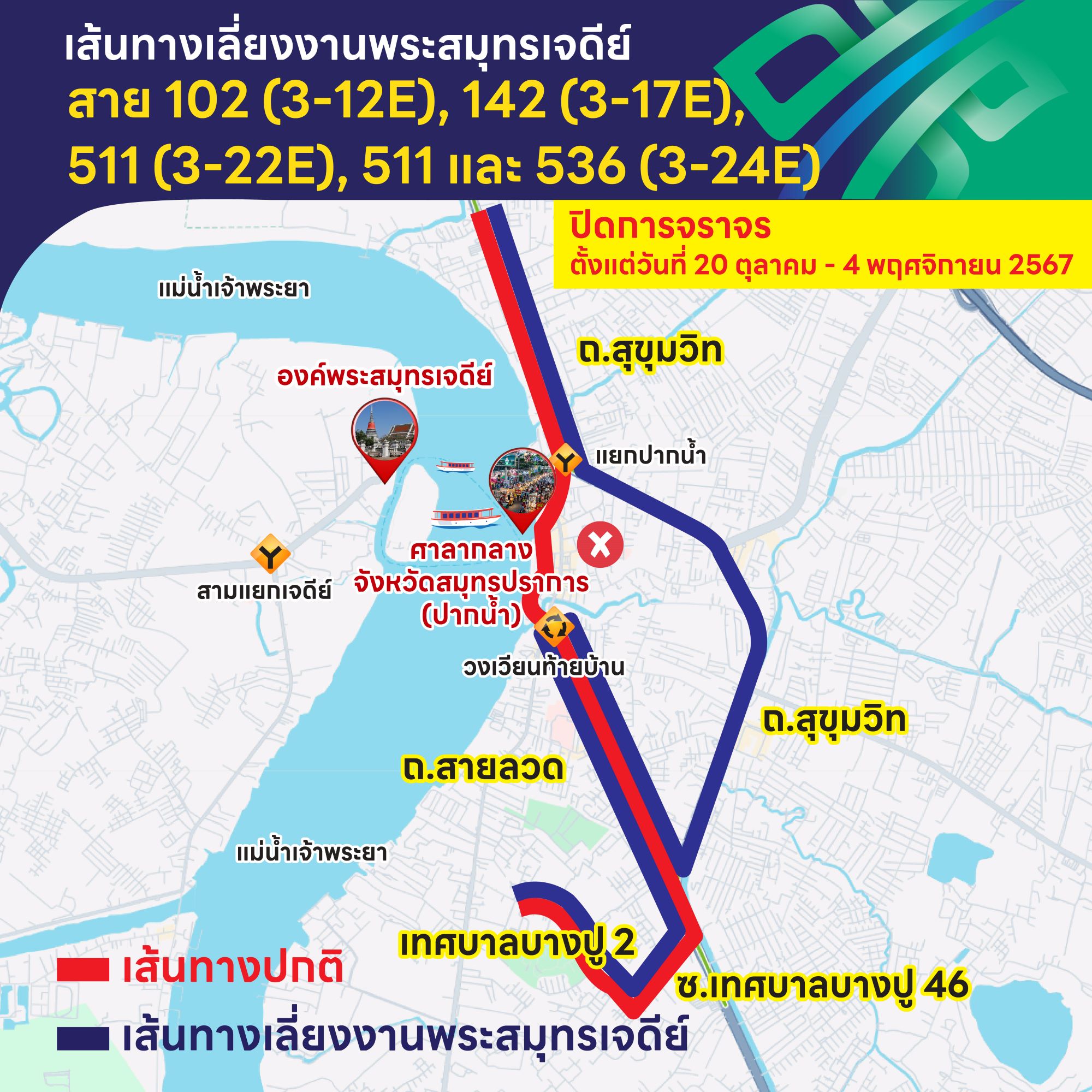 ทั้งนี้ งานจราจร สภ.เมืองสมุทรปราการ ประกาศห้ามรถโดยสารประจำทางเดินรถในเขต ตลาดปากน้ำบนถนนประโคนชัย ถนนศรีสมุทร และถนนด่านเก่า ตลอดเวลา ตั้งแต่วันที่ 20 ตุลาคม 2567 – 4 พฤศจิกายน 2567 ขสมก. จึงมีความจำเป็นต้องปรับเปลี่ยนเส้นทางเดินรถโดยสาร จำนวน 10 เส้นทาง ได้แก่ สาย 20 (เสริม), 23 (3 – 4E), 25 (3 – 7E), 102 (3 – 12E), 142 (3 – 17E), 145 (3 – 18), 3 – 19E, 511, 511 (3 – 22E) และสาย 536 (3 – 24E) เพื่อเลี่ยงการจราจร โดยให้รถโดยสารสายดังกล่าว วิ่งบนถนนสุขุมวิทแทน นอกจากนี้ ขสมก. ได้จัดเตรียมหัวหน้างานเดินรถและนายตรวจ ประจำจุดบริเวณถนนสายลวด, สำนักงานสรรพากรพื้นที่สมุทรปราการ 1, ศูนย์ป้องกันภัยและบรรเทาสาธารณภัยเทศบาลนครสมุทรปราการ, แยกการไฟฟ้าสมุทรปราการ และวิทยาลัยสารพัดช่างสมุทรปราการ ในการอำนวยความสะดวกด้านการจราจร ดูแลความปลอดภัยในการขึ้น – ลงรถ และประชาสัมพันธ์ข้อมูลการเดินรถให้กับประชาชน