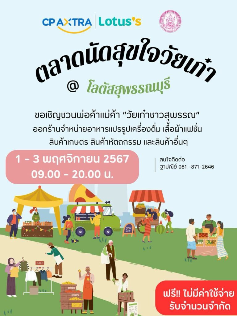 กรมกิจการผู้สูงอายุ เชิญชวน“วัยเก๋า” ชาวสุพรรณบุรี ออกร้านจำหน่ายสินค้า ณ โลตัสสุพรรณบุรี ข่าวสารกิจกรรม กรมกิจการผู้สูงอายุ เชิญชวน“วัยเก๋า” ชาวสุพรรณบุรี ออกร้านจำหน่ายสินค้า ณ โลตัสสุพรรณบุรี กรมกิจการผู้สูงอายุ ร่วมกับ บริษัท ซีพี แอ็กซ์ตร้า จำกัด (มหาชน) เชิญชวน“วัยเก๋า” ชาวสุพรรณบุรี ออกร้านจำหน่ายอาหารแปรรูปเครื่องดื่ม เสื้อผ้าแฟชั่น สินค้าเกษตร สินค้าหัตถกรรม และสินค้าอื่นๆ ในวันที่ 1 – 3 พฤศจิกายน 2567 เวลา 09.00 – 20.00 น. ณ โลตัสสุพรรณบุรี ฟรี ไม่มีค่าใช้จ่ายในการออกร้าน สนใจติดต่อ กองส่งเสริมศักยภาพผู้สูงอายุ คุณฐาปณีย์ โทร. 08 1871 2646 ที่มา : https://citly.me/zr6Ns Post Views: 7 FacebookFacebookXTwitterLINELine