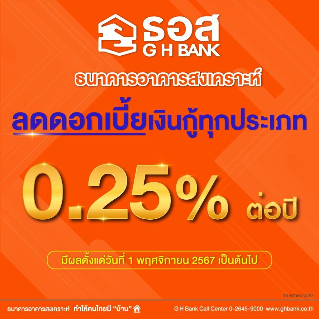 ธอส. ปรับลดดอกเบี้ยเงินกู้ทุกประเภท 0.25% มีผลตั้งแต่วันที่ 1 พฤศจิกายน 2567