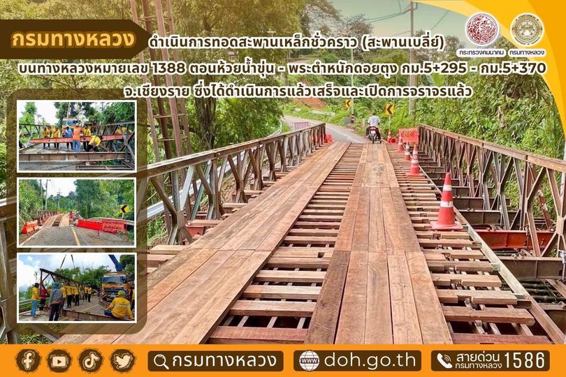 กรมทางหลวง โดยศูนย์สร้างและบูรณะสะพานที่ 1 (พิจิตร) ได้เข้าดำเนินการทอดสะพานเหล็กชั่วคราว (สะพานเบลี่ย์) บนทางหลวงหมายเลข 1388 ตอนห้วยน้ำขุ่น – พระตำหนักดอยตุง กม.5+295 – กม.5+370 จ.เชียงราย ความยาวสะพาน 36 เมตร ซึ่งเริ่มเข้าพื้นที่และติดตั้งเมื่อวันที่ 19 ต.ค. 67 เวลา 06.00 น. และได้ดำเนินการแล้วเสร็จและเปิดการจราจรแล้ว เมื่อเวลา 18.00 น. ของวันเดียวกัน ทั้งนี้ ขอความร่วมมือรถบรรทุกโปรดปฏิบัติตามป้ายจำกัดน้ำหนักอย่างเคร่งครัด