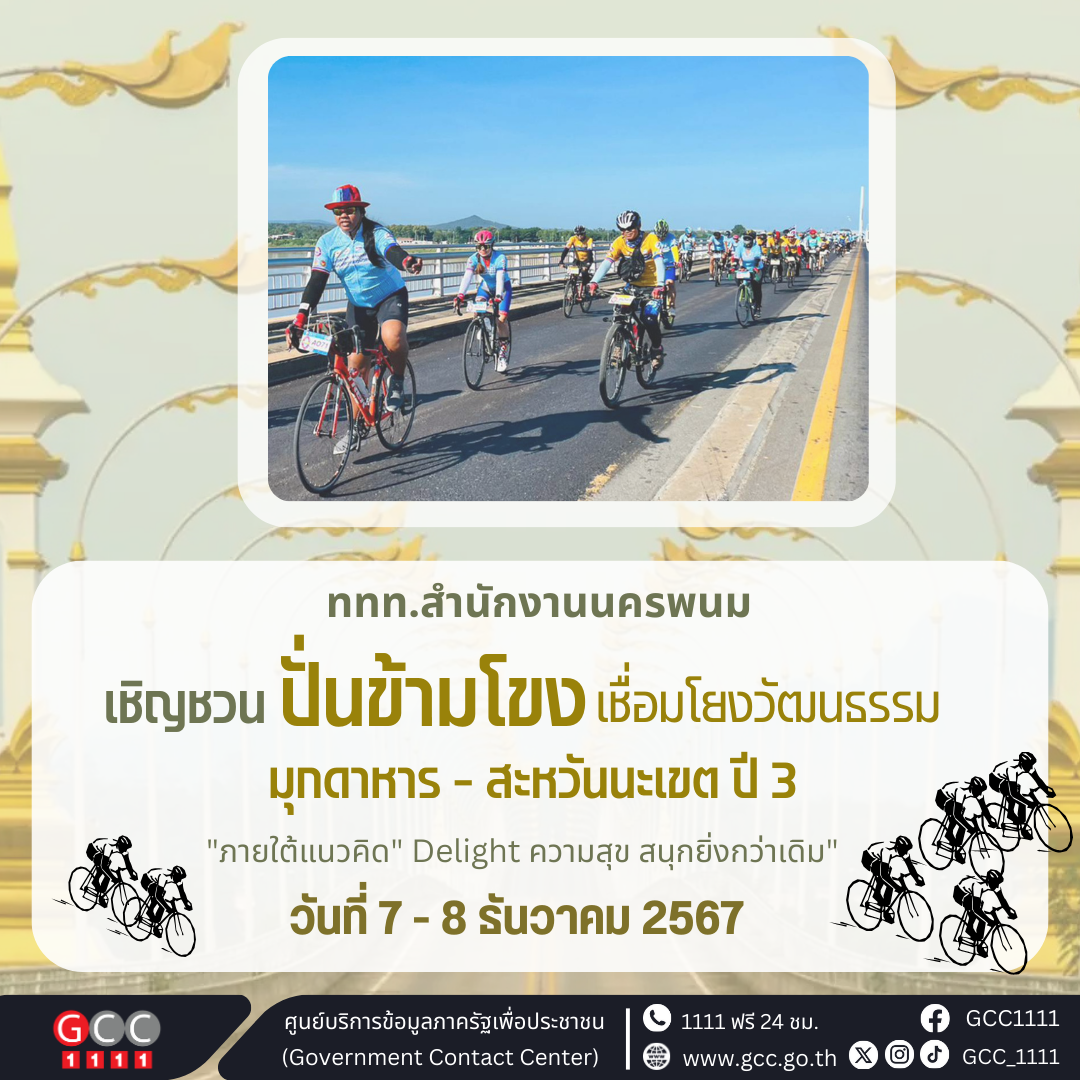 ททท.สำนักงานนครพนม เชิญชวนร่วม กิจกรรม “ปั่นข้ามโขง เชื่อมโยงวัฒนธรรม มุกดาหาร – สะหวันนะเขต ปี 3” “ภายใต้แนวคิด “Delight ความสุข สนุกยิ่งกว่าเดิม” สัมผัสวัฒธรรมวิถีชีวิตลุ่มน้ำโขง เมืองคู่แฝดลุ่มน้ำโขง