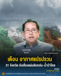 ศปช. แจ้งเตือนเฝ้าระวังแผ่นดินถล่มและน้ำป่าไหลหลาก ช่วงวันที่ 21 – 23 ตุลาคม 2567