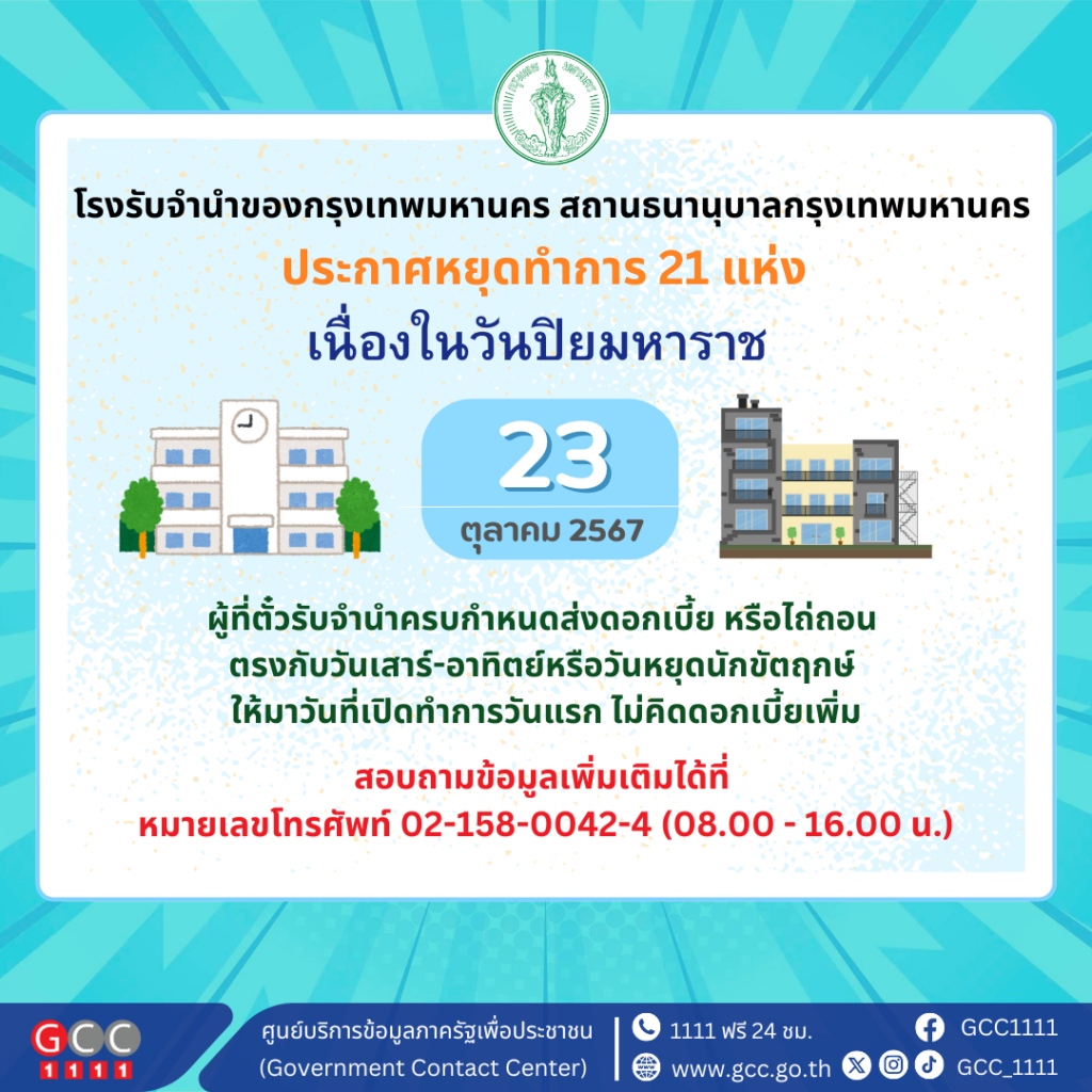 สถานธนานุบาลกรุงเทพมหานคร ประกาศหยุด วันที่ 23 ตุลาคม 2567
