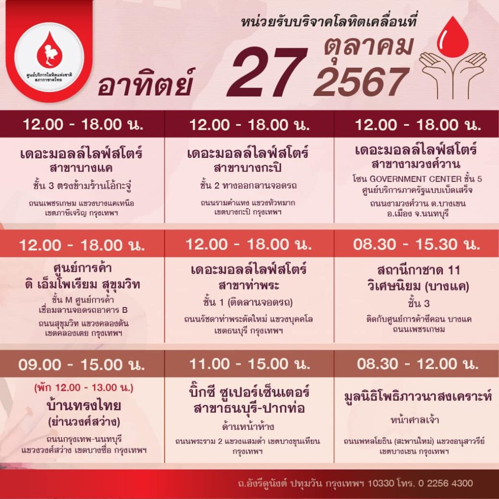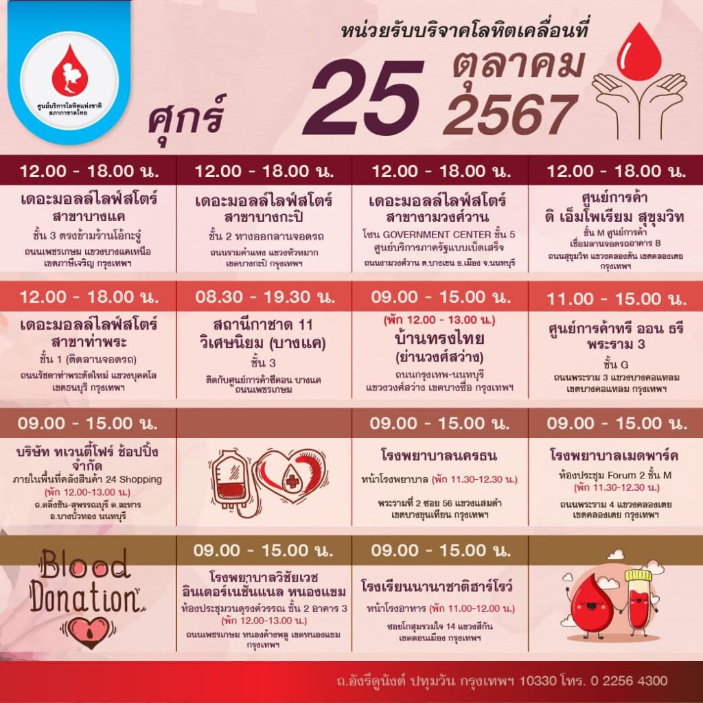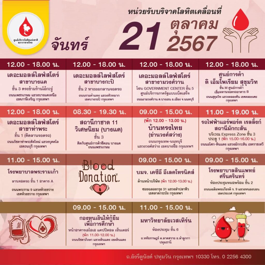 สภากาชาดไทย ออกหน่วยรับบริจาคโลหิตเคลื่อนที่ วันที่ 21 – 27 ตุลาคม 2567