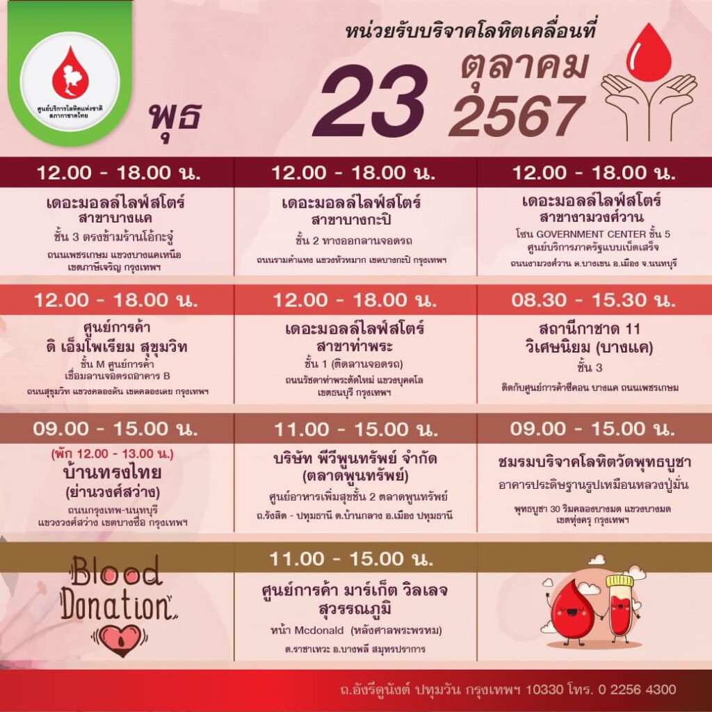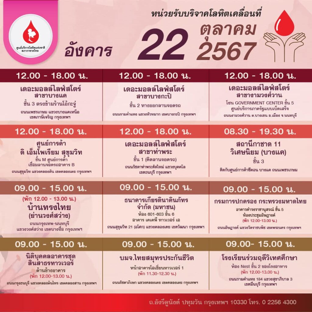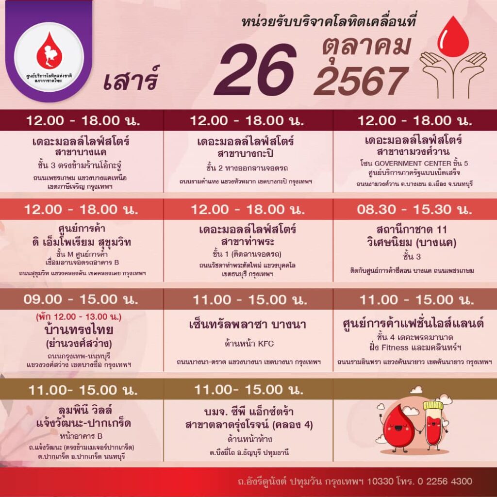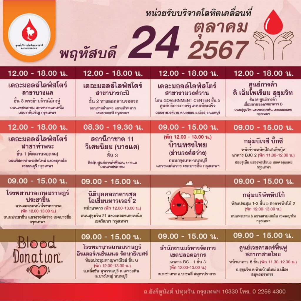 สภากาชาดไทย ออกหน่วยรับบริจาคโลหิตเคลื่อนที่ วันที่ 21 – 27 ตุลาคม 2567