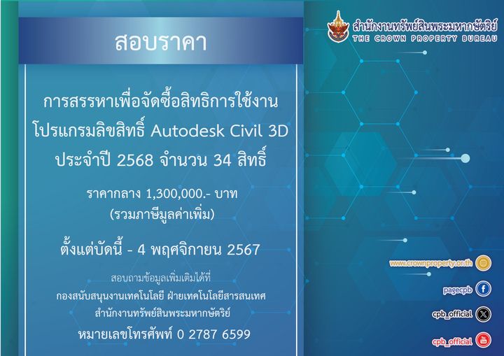 สำนักงานทรัพย์สินพระมหากษัตริย์ เปิดสอบราคาเพื่อจัดซื้อสิทธิการใช้โปรแกรมลิขสิทธิ์ Autodesk Civil 3D ปี 68