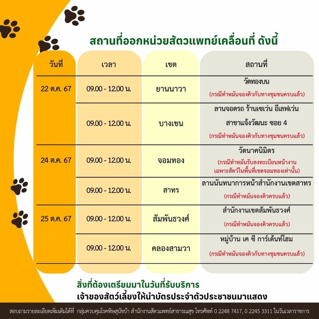สำนักอนามัย กรุงเทพมหานคร ออกหน่วยสัตวแพทย์เคลื่อนที่ ในวันที่ 22,24 และ 25 ต.ค.67