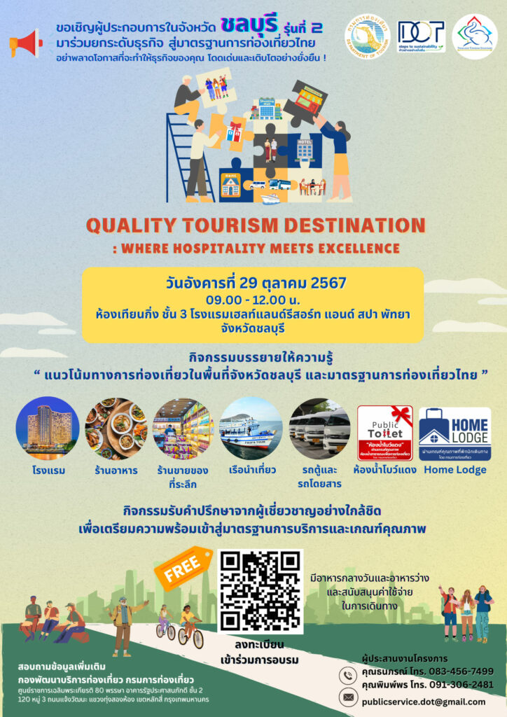 กรมการท่องเที่ยว ขอเชิญผู้ประกอบการ ผู้ให้บริการด้านการท่องเที่ยว บริษัทนำเที่ยว โรงแรม ร้านอาหาร ห้องน้ำสาธาณะ เข้าร่วมกิจกรรมการพัฒนาเมืองคุณภาพบริการท่องเที่ยว : Quality Tourism Destination “Quality Tourism Destination : Where Hospitality Meets Excellence” จังหวัดชลบุรี รุ่นที่ 2 วันอังคารที่ 29 ตุลาคม 2567 เวลา 09.00 – 12.00 น. ณ ห้องเทียนกิ่ง ชั้น 3 โรงแรมเฮลท์แลนด์รีสอร์ท แอนด์ สปา พัทยา จังหวัดชลบุรี