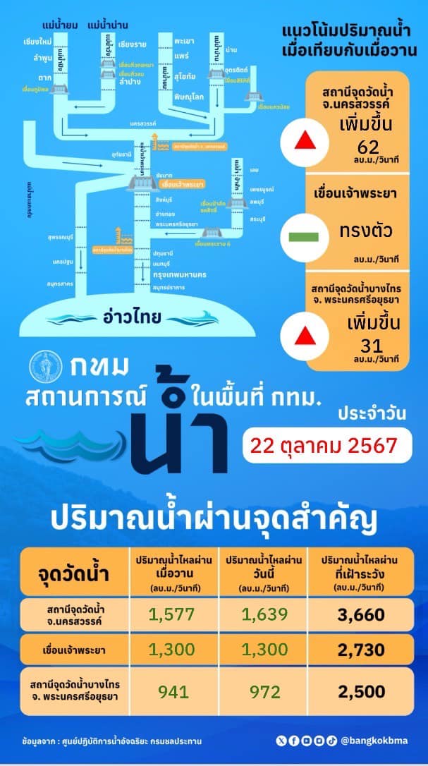 กรุงเทพมหานคร แจ้งสถานการณ์น้ำในพื้นที่ กทม. ประจำวันที่ วันที่ 22 ตุลาคม 2567 ณ เวลา 11.30 น. ปริมาณน้ำผ่านจุดสำคัญ สถานีจุดวัดน้ำ จ.นครสวรรค์ ปริมาณน้ำไหลผ่าน 1,639 ลบ.ม./วินาที เพิ่มขึ้น 62 ลบ.ม./วินาที ปริมาณน้ำไหลผ่านที่เฝ้าระวัง อยู่ที่ 3,660 ลบ.ม./วินาที, จุดวัดน้ำบริเวณเขื่อนเจ้าพระยา ปริมาณน้ำไหลผ่าน 1,300 ลบ.ม./วินาที ทรงตัว ปริมาณน้ำไหลผ่านที่เฝ้าระวัง อยู่ที่ 2,730 ลบ.ม./วินาที, สถานีจุดวัดน้ำบางไทร จ.พระนครศรีอยุธยา ปริมาณน้ำไหลผ่าน 972 ลบ.ม./วินาที เพิ่มขึ้น 31 ลบ.ม./วินาที ปริมาณน้ำไหลผ่านที่เฝ้าระวัง อยู่ที่ 2,500 ลบ.ม./วินาที