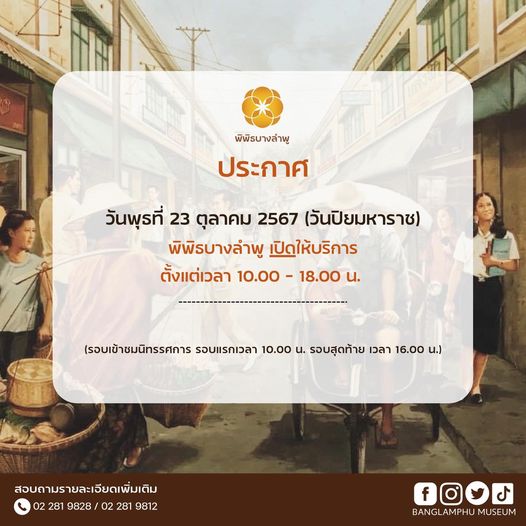 พิพิธบางลำพู แจ้งเปิดให้บริการตามปกติ วันพุธที่ 23 ตุลาคม 2567 (วันปิยมหาราช) ข่าวสารกิจกรรม พิพิธบางลำพู แจ้งเปิดให้บริการตามปกติ วันพุธที่ 23 ตุลาคม 2567 (วันปิยมหาราช) พิพิธบางลำพู แจ้งเปิดให้บริการตามปกติ วันพุธที่ 23 ตุลาคม 2567 (วันปิยมหาราช) ตั้งแต่เวลา 10.00 – 18.00 น. (รอบเข้าชม รอบสุดท้าย เวลา 16.00 น.) (รอบเข้าชมนิทรรศการ รอบแรกเวลา 10.00 น. รอบสุดท้าย เวลา 16.00 น.) สอบถามรายละเอียดเพิ่มเติม เข้าชมนิทรรศการ โทร. 02 281 9828 ร้านจำหน่ายสินค้าที่ระลึกฯ โทร. 02 281 9812 ที่มา : https://citly.me/KNxPu Post Views: 4 FacebookFacebookXTwitterLINELine