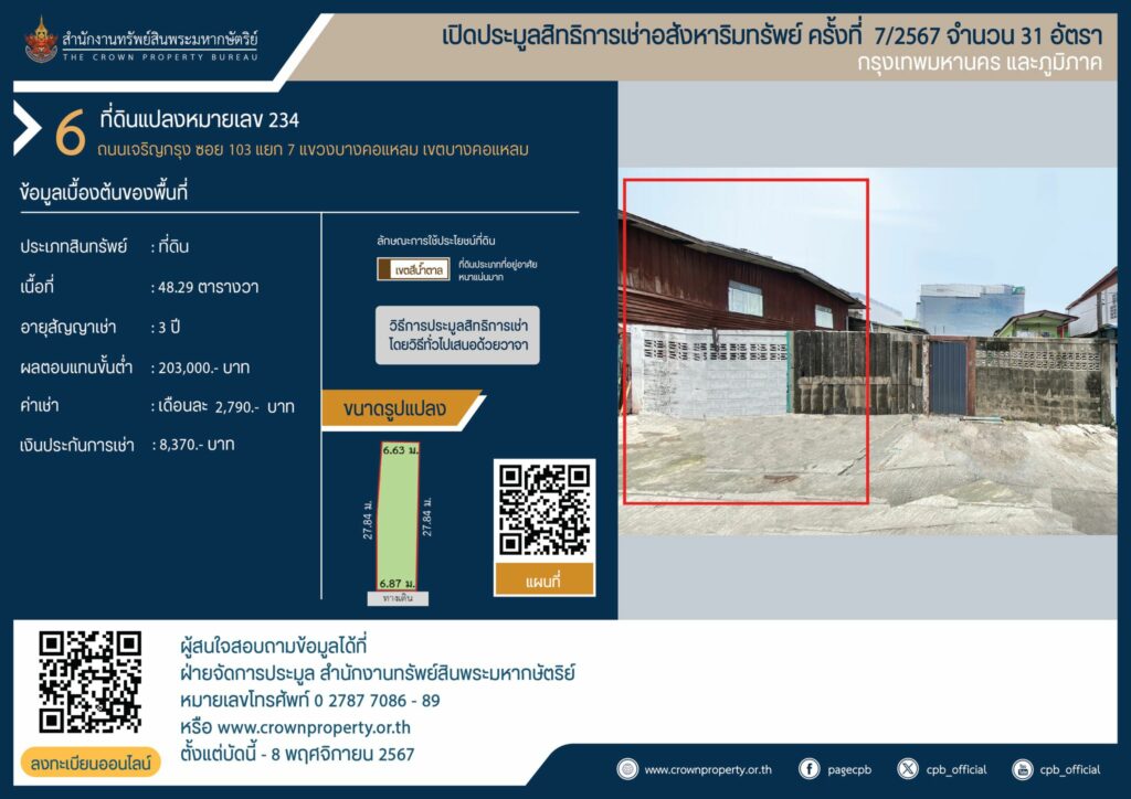 สำนักงานทรัพย์สินพระมหากษัตริย์ เปิดประมูลสิทธิการเช่าอสังหาริมทรัพย์ ที่ดินแปลง 234, 234/1 เขตบางคอแหลม