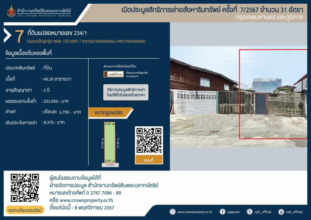 สำนักงานทรัพย์สินพระมหากษัตริย์ เปิดประมูลสิทธิการเช่าอสังหาริมทรัพย์ ครั้งที่ 7/2567 เขตบางคอแหลม กรุงเทพมหานคร จำนวน 2 อัตรา