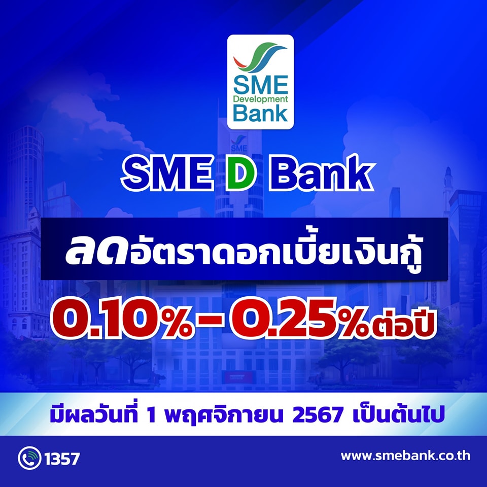 SME D Bank ประกาศลดอัตราดอกเบี้ยเงินกู้ลงสูงสุด 0.25% ต่อปี มีผล 1 พ.ย. 67