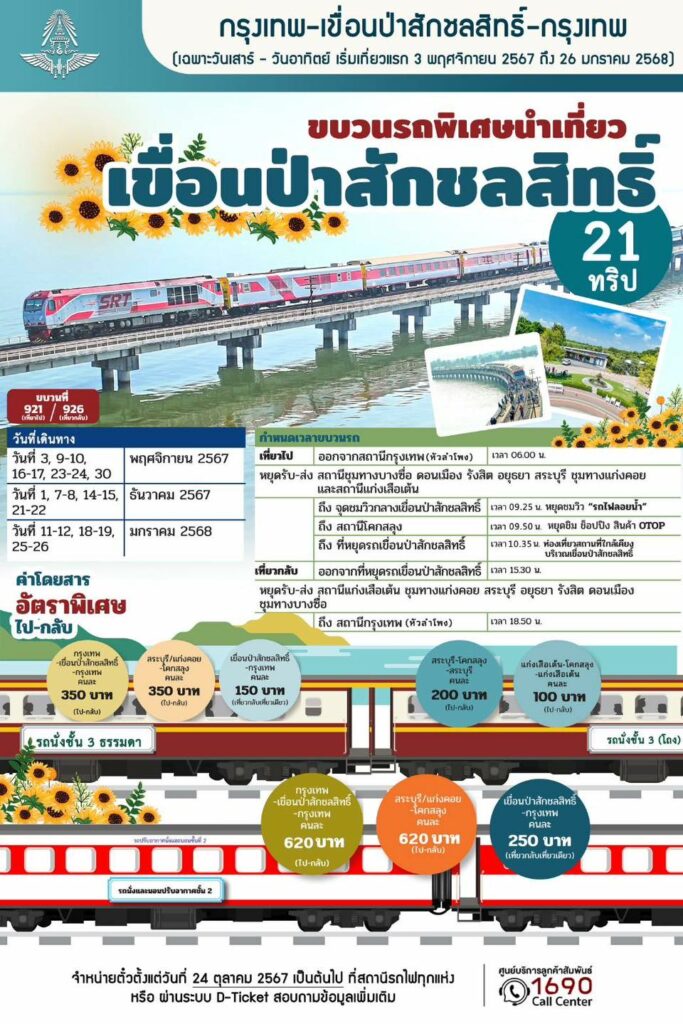การรถไฟแห่งประเทศไทย ขอเชิญชวนนักท่องเที่ยวนั่งรถไฟ “ลอยน้ำ รับลมหนาว ชมวิวกลางเขื่อน” เส้นทาง Unseen ของการรถไฟฯ โดยเปิดให้บริการขบวนรถพิเศษนำเที่ยว เส้นทางกรุงเทพ – เขื่อนป่าสักชลสิทธิ์ – กรุงเทพ ซึ่งเป็นทางรถไฟที่อยู่เหนืออ่างเก็บน้ำ ระยะทางรวม 24 กิโลเมตรจำหน่ายตั๋วพร้อมกันทั่วประเทศ 24 ตุลาคม 2567 นี้