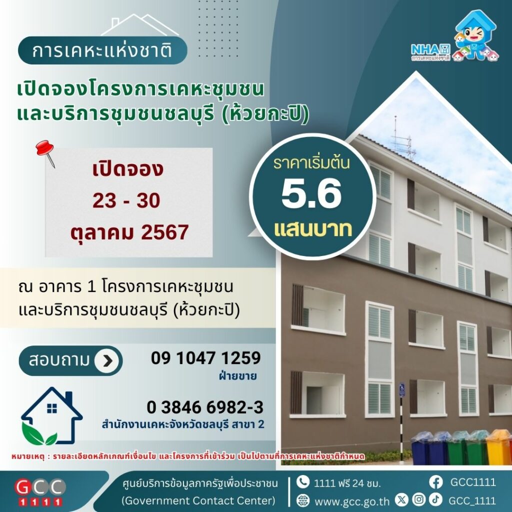 การเคหะแห่งชาติ เปิดจองโครงการเคหะชุมชนและบริการชุมชนชลบุรี (ห้วยกะปิ) อาคารชุดพักอาศัย 4 ชั้น พื้นที่ใช้สอย 32 ตร.ม.* 1 ห้องนอน 1 ห้องน้ำ ราคาเริ่มต้นแค่ 5.6 แสนบาท จองเริ่มต้นเพียง 1,000 บาท (เลือกผ่อนตรงกับการเคหะฯ ได้) เปิดจองระหว่างวันที่ 23 – 30 ตุลาคม 2567 ณ อาคาร 1 โครงการเคหะชุมชนและบริการชุมชนชลบุรี (ห้วยกะปิ)