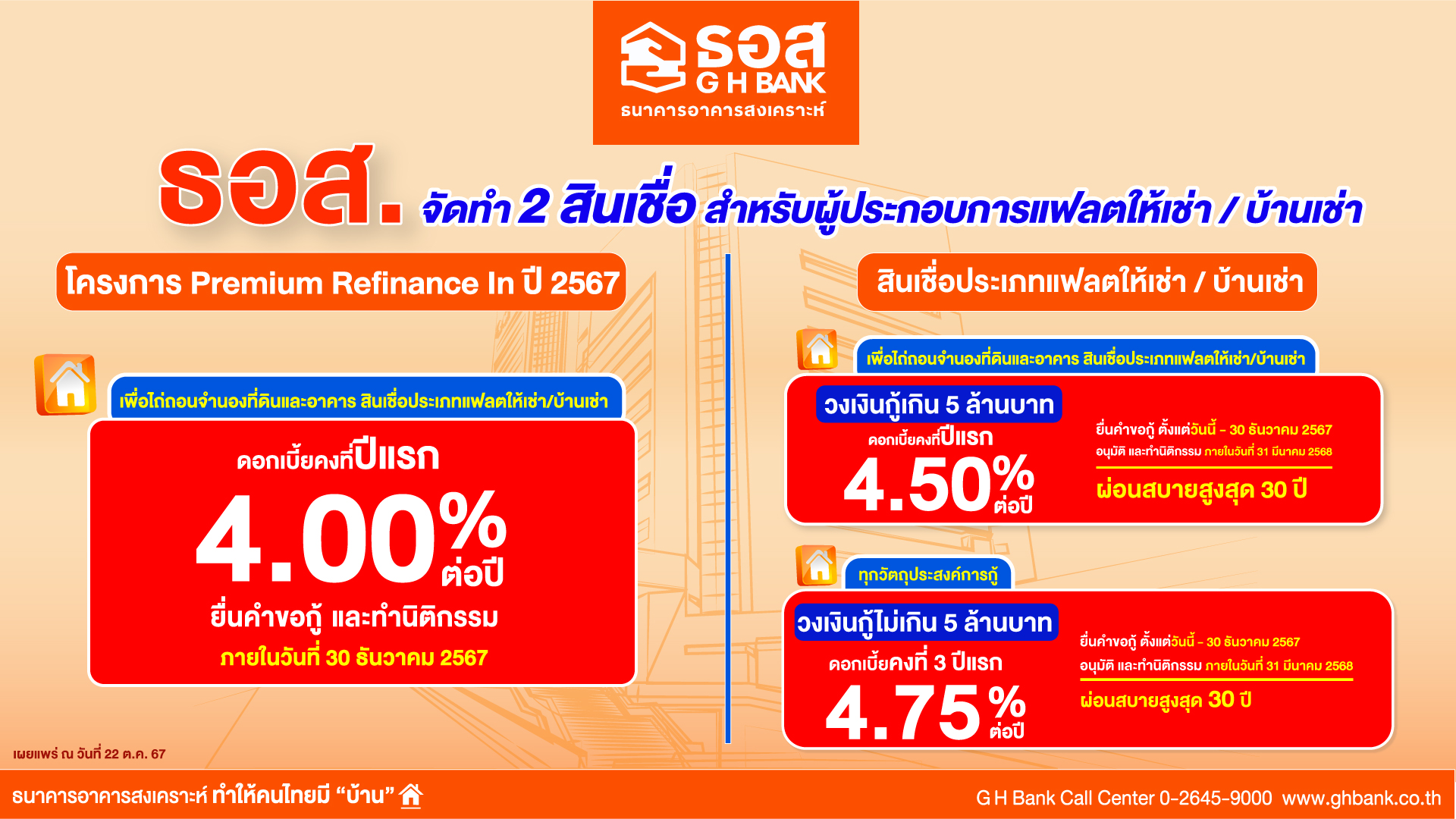 - โครงการ Premium Refinance In ปี 2567 เพื่อไถ่ถอนจำนองที่ดินและอาคาร สินเชื่อประเภทแฟลตให้เช่า / บ้านเช่า : สำหรับผู้ประกอบการที่ต้องการไถ่ถอนจำนองที่ดินและอาคารแฟลตให้เช่า / บ้านเช่า รวมถึงเพื่อซื้ออุปกรณ์หรือสิ่งอำนวยความสะดวกที่เกี่ยวเนื่องเพื่อประโยชน์ในการอยู่อาศัย อัตราดอกเบี้ย ปีที่ 1 คงที่ เท่ากับ 4.00% ต่อปี, ปีที่ 2 คงที่ เท่ากับ 4.50% ต่อปี, ปีที่ 3 คงที่ เท่ากับ 5.00% ต่อปี (อัตราดอกเบี้ยเฉลี่ย 3 ปีแรกเพียง 4.50% ต่อปี) ปีที่ 4 – 5 เท่ากับ MLR-1.00% ต่อปี (5.50% ต่อปี) และปีที่ 6 จนถึงตลอดอายุสัญญา เท่ากับ MLR (อัตราดอกเบี้ย MLR ของ ธอส. ในปัจจุบัน เท่ากับ 6.50% ต่อปี) ระยะเวลาการกู้นานสูงสุด 30 ปี พิเศษ! ยกเว้นค่าธรรมเนียมการยื่นกู้ และค่าประเมินหลักประกัน ผู้ที่สนใจสามารถยื่นคำขอกู้ได้ตั้งแต่วันนี้เป็นต้นไป และทำนิติกรรมถึงวันที่ 30 ธันวาคม 2567 หรือก่อนระยะเวลาดังกล่าว หากธนาคารให้สินเชื่อเต็มกรอบวงเงินโครงการแล้ว (กู้เท่าที่จำเป็นและชำระคืนไหว)