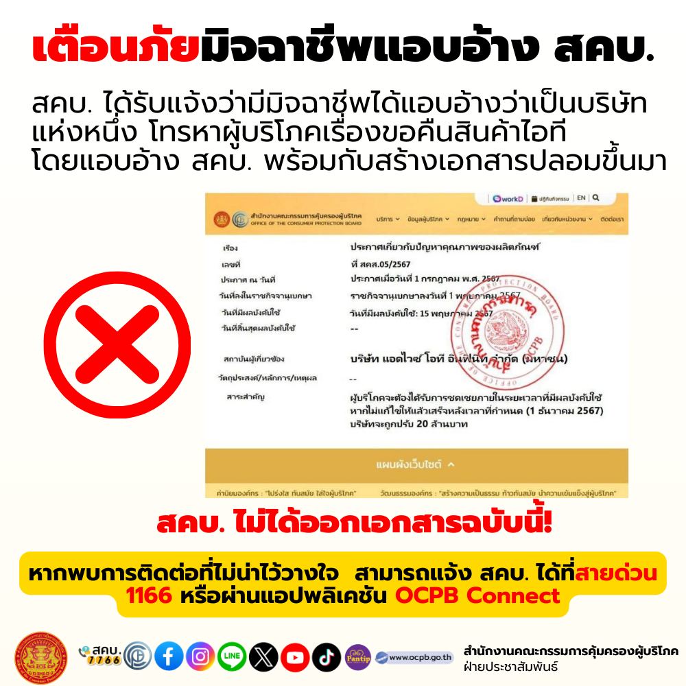 สคบ. ได้รับแจ้งว่ามีมิจฉาชีพได้แอบอ้างว่าเป็นบริษัท แห่งหนึ่ง โทรหาผู้บริโภคเรื่องขอคืนสินค้าไอที โดยแอบอ้าง สคบ. พร้อมกับสร้างเอกสารปลอมขึ้นมา สคบ. ไม่ได้ออกเอกสารฉบับนี้ หากพบการติดต่อที่ไม่น่าไว้วางใจ สามารถแจ้ง สคบ. ได้ที่สายด่วน 1166 หรือผ่านแอปพลิเคชัน OCPB Connect
