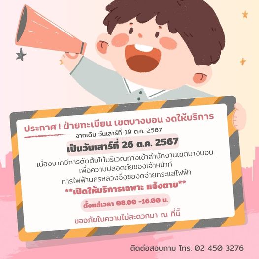 ฝ่ายทะเบียน สำนักงานเขตบางบอน เลื่อนงดให้บริการ จากเดิม วันเสาร์ที่ 19 ตุลาคม 2567 เป็น วันเสาร์ที่ 26 ตุลาคม 2567 เนื่องจากมีการตัดต้นไม้บริเวณทางเข้าสำนักงานเขตบางบอน โดยจะเปิดเฉพาะบริการแจ้งตายเท่านั้น ตั้งแต่เวลา 08.00 – 16.00 น. สอบถามข้อมูลเพิ่มเติมได้ที่ หมายเลขโทรศัพท์ 02-450-3276
