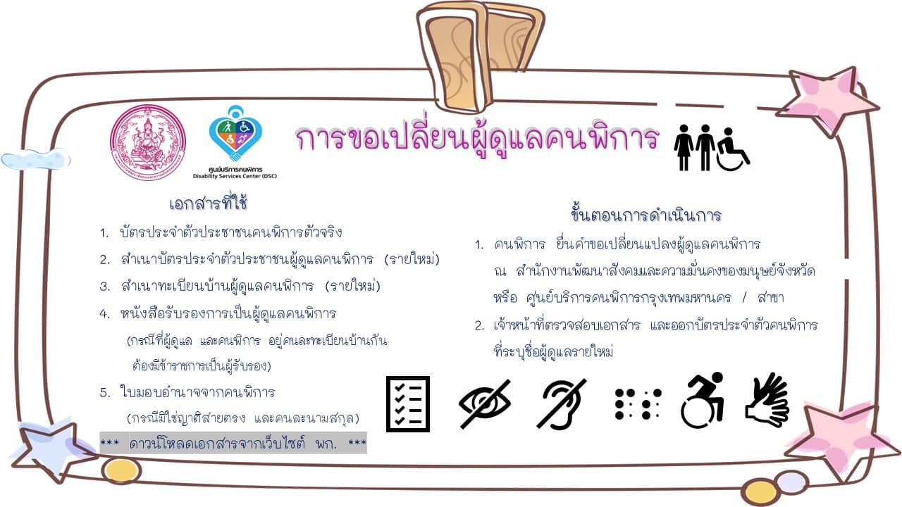พก. แนะนำเอกสารที่ต้องใช้ และขั้นตอนการดำเนินการสำหรับคนพิการที่ต้องการขอเปลี่ยนผู้ดูแลคนพิการ