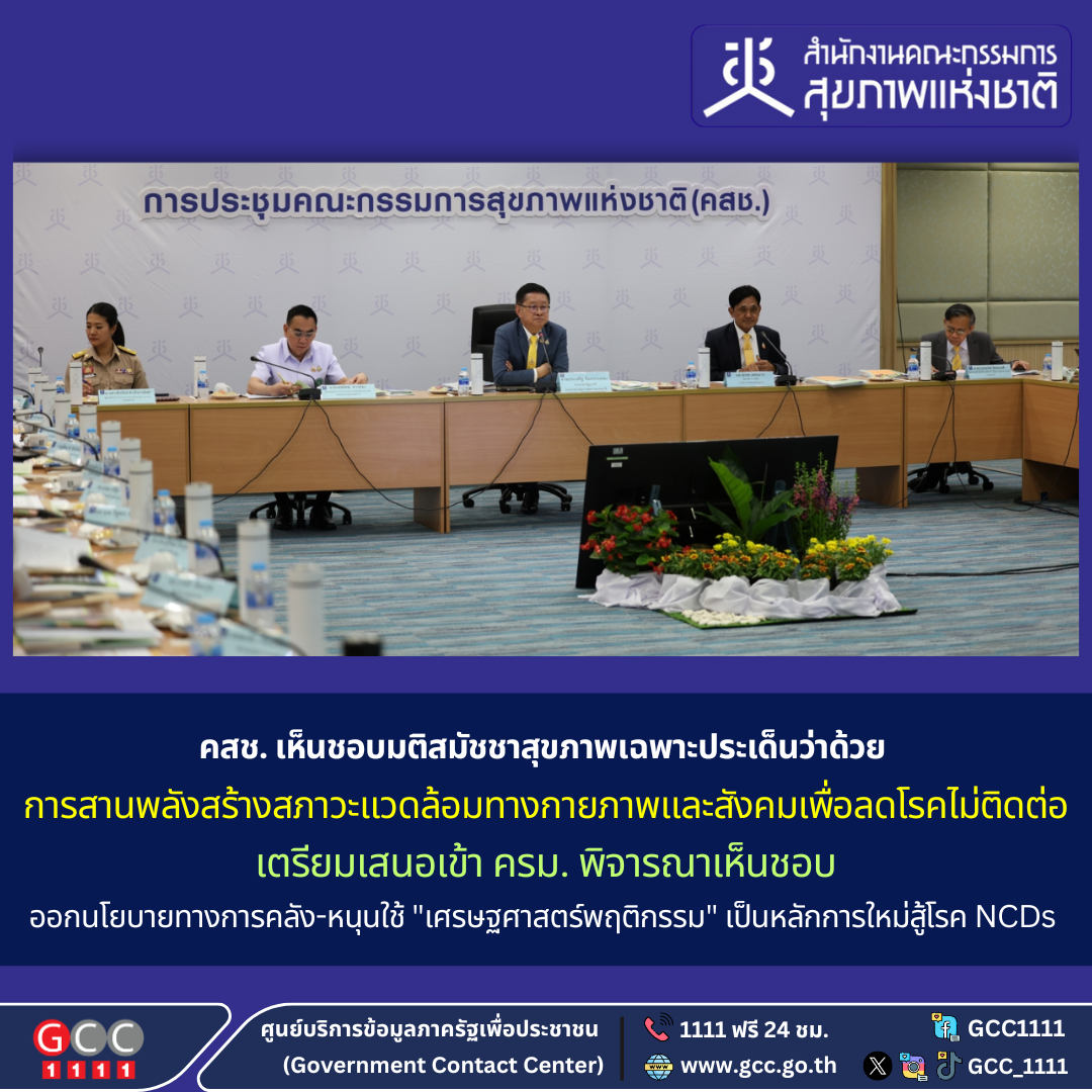 ที่ประชุมคณะกรรมการสุขภาพแห่งชาติ (คสช.) ครั้งที่ 4/2567 เมื่อวันที่ 21 ต.ค. 67 ซึ่งมี นายประเสริฐ จันทรรวงทอง รองนายกรัฐมนตรี และรัฐมนตรีว่าการกระทรวงดิจิทัลเพื่อเศรษฐกิจและสังคม ในฐานะประธาน คสช. เป็นประธานการประชุม ได้มีมติเห็นชอบ มติสมัชชาสุขภาพเฉพาะประเด็นว่าด้วย การสานพลังสร้างสภาวะแวดล้อมทางกายภาพและสังคมเพื่อลดโรคไม่ติดต่อ ที่มีสาระสำคัญในการพัฒนา 5 ระบบและกลไกที่สนับสนุนให้เกิด 5 มาตรการป้องกันและควบคุมการเจ็บป่วยด้วยโรคไม่ติดต่อ (NCDs) โดยประยุกต์ใช้แนวคิดเศรษฐศาสตร์พฤติกรรม กลไกการคลัง และกลไกเครดิตทางสังคม