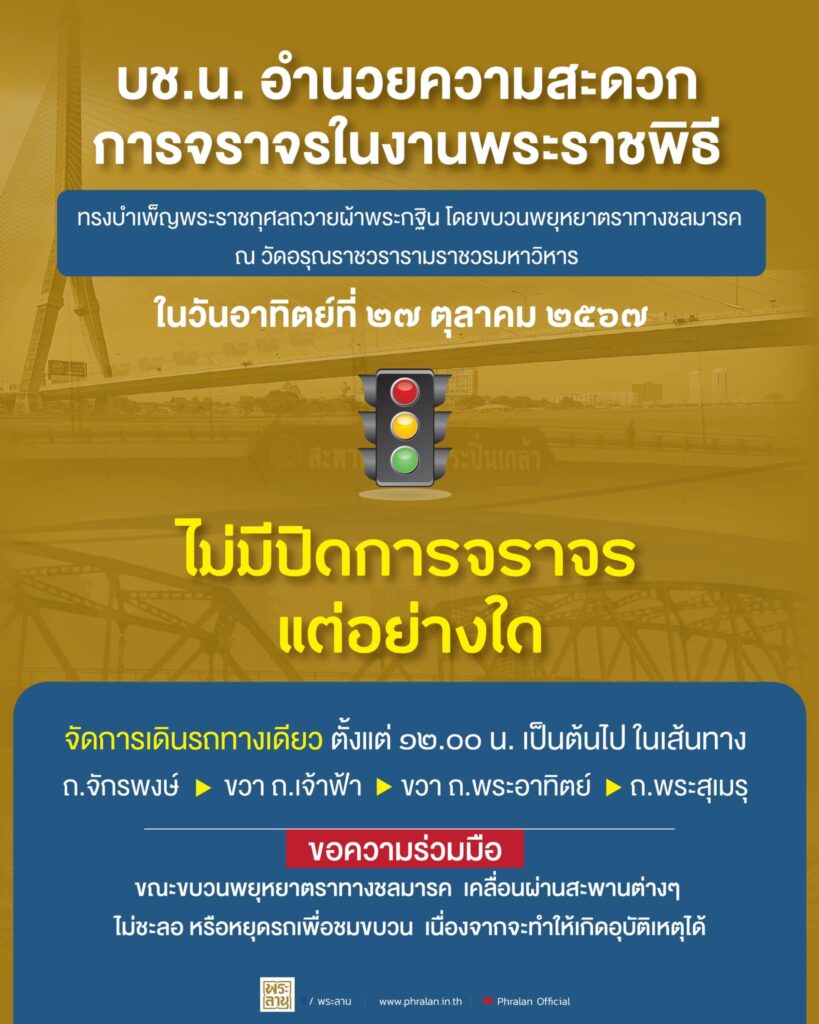 บช.น. แจ้งไม่ปิดการจราจร พร้อมอำนวยการจราจรและ ขอเชิญชวนประชาชนร่วมเฝ้าฯ รับเสด็จ วันที่ 27 ต.ค.67