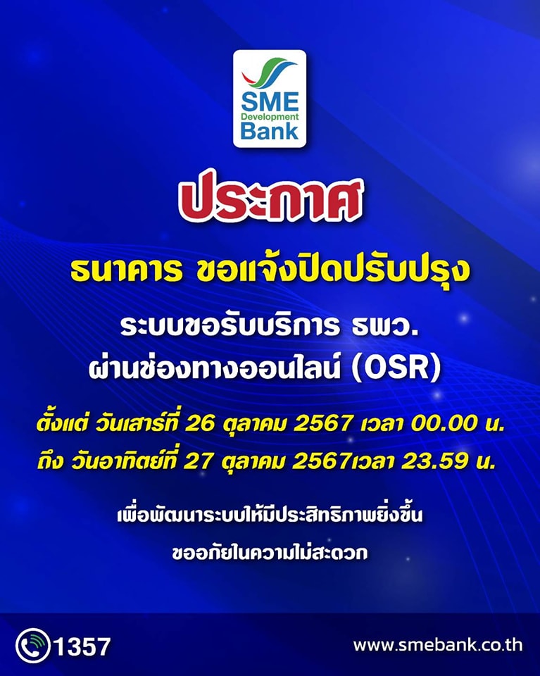 SME D Bank แจ้งปิดปรับปรุงระบบขอรับบริการ ธพว. ผ่านช่องทางออนไลน์ (OSR) วันที่ 26 – 27 ต.ค. 67