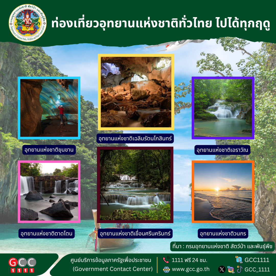 กรมอุทยานแห่งชาติ สัตว์ป่า และพันธุ์พืช แนะนำท่องเที่ยวอุทยานแห่งชาติทั่วไทย ไปได้ทุกฤดู เพียงแค่เลือกสถานที่และช่วงเวลาให้เหมาะสม อาทิ อุทยานแห่งชาติขุนขาน, อุทยานแห่งชาติเฉลิมรัตนโกสินทร์, อุทยานแห่งชาติเอราวัณ, อุทยานแห่งชาติตาดโตน, อุทยานแห่งชาติเขื่อนศรีนครินทร์, อุทยานแห่งชาติวนกร
