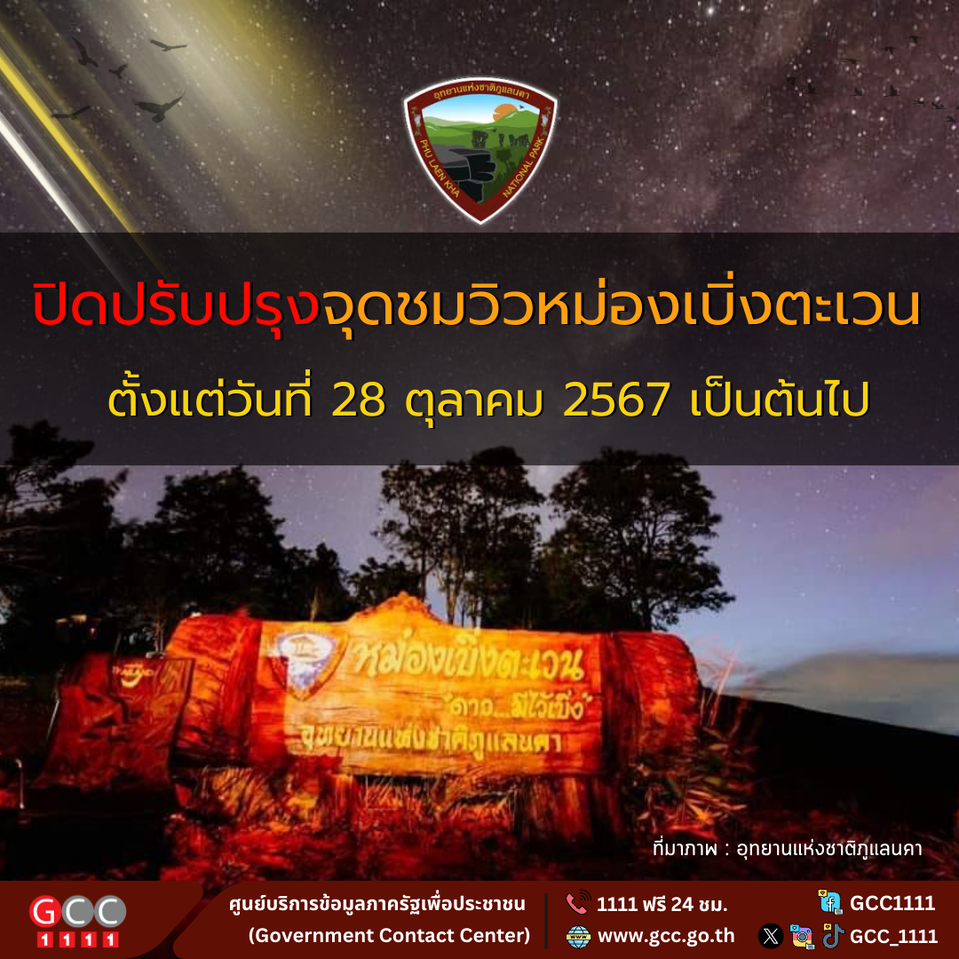 อุทยานแห่งชาติภูแลนคา ปิดปรับปรุงจุดชมวิวหม่องเบิ่งตะเวน เพิ่มความปลอดภัยและความงดงามของแหล่งท่องเที่ยว โดยมีผลตั้งแต่วันที่ 28 ตุลาคม 2567 เป็นต้นไป