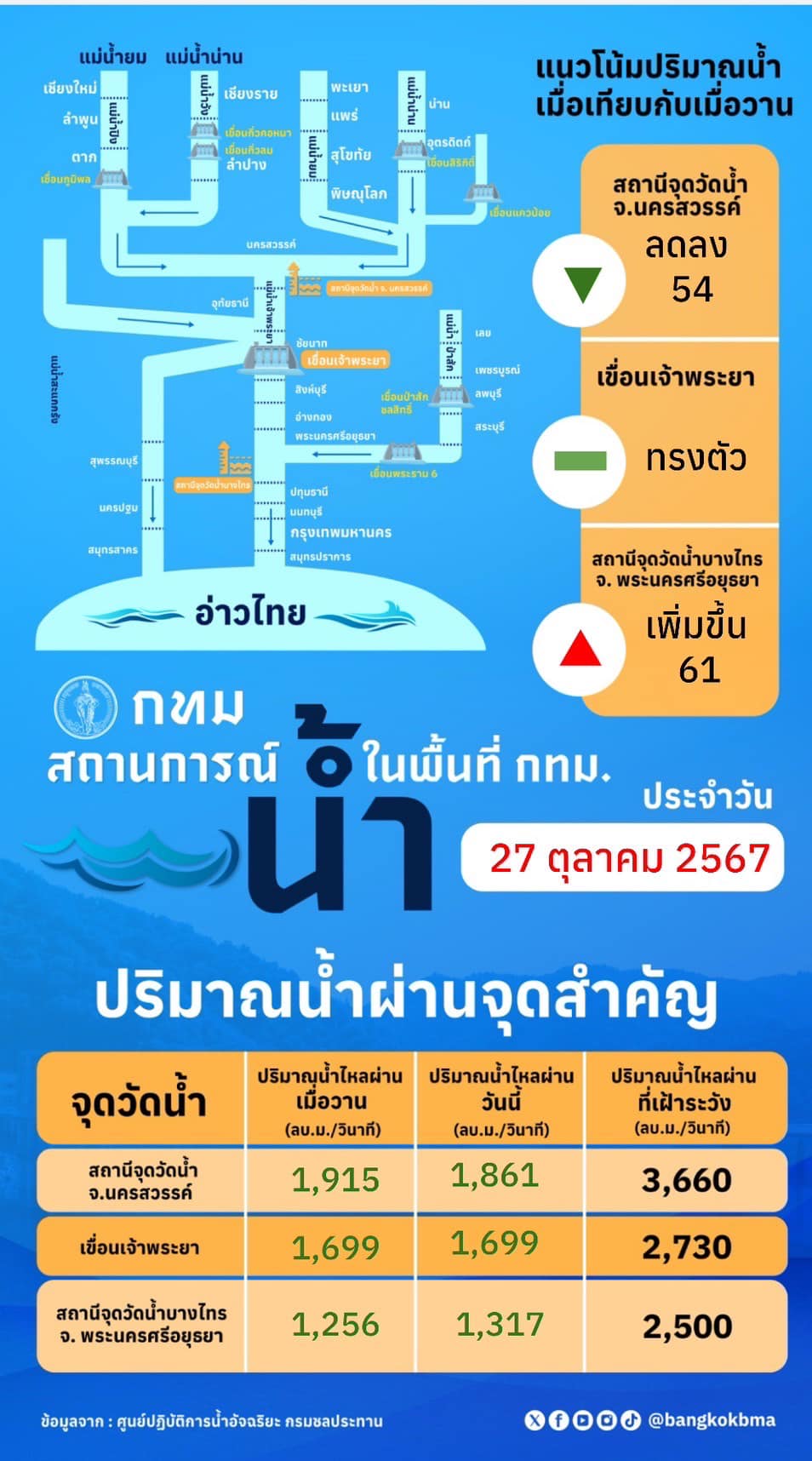 กรุงเทพมหานคร แจ้งสถานการณ์น้ำในพื้นที่ กทม. ประจำวันที่ วันที่ 27 ตุลาคม 2567 ณ เวลา 11.30 น. ปริมาณน้ำผ่านจุดสำคัญ สถานีจุดวัดน้ำ จ.นครสวรรค์ ปริมาณน้ำไหลผ่าน 1,861 ลบ.ม./วินาที ลดลง 54 ลบ.ม./วินาที ปริมาณน้ำไหลผ่านที่เฝ้าระวัง อยู่ที่ 3,660 ลบ.ม./วินาที, จุดวัดน้ำบริเวณเขื่อนเจ้าพระยา ปริมาณน้ำไหลผ่าน 1,699 ลบ.ม./วินาที ทรงตัว ปริมาณน้ำไหลผ่านที่เฝ้าระวัง อยู่ที่ 2,730 ลบ.ม./วินาที, สถานีจุดวัดน้ำบางไทร จ.พระนครศรีอยุธยา ปริมาณน้ำไหลผ่าน 1,317 ลบ.ม./วินาที เพิ่มขึ้น 61 ลบ.ม./วินาที ปริมาณน้ำไหลผ่านที่เฝ้าระวัง อยู่ที่ 2,500 ลบ.ม./วินาที