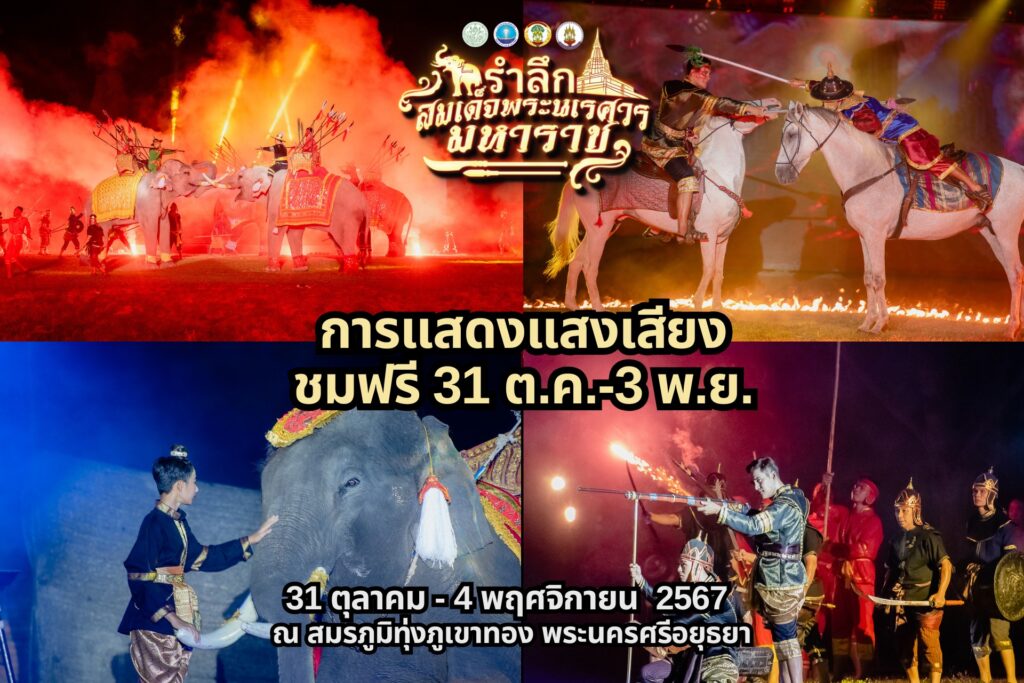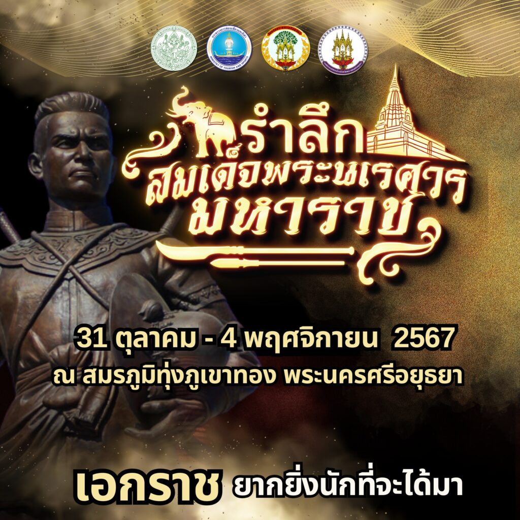 การท่องเที่ยวแห่งประเทศไทย เชิญร่วมงานรำลึกสมเด็จพระนเรศวรมหาราช ประจำปี 2567 ระหว่างวันที่ 31 ตุลาคม – 4 พฤศจิกายน 2567 ณ พระบรมราชานุสาวรีย์สมเด็จพระนเรศวรมหาราช(อ่างเก็บน้ำทุ่งภูเขาทอง) จ.พระนครศรีอยุธยา