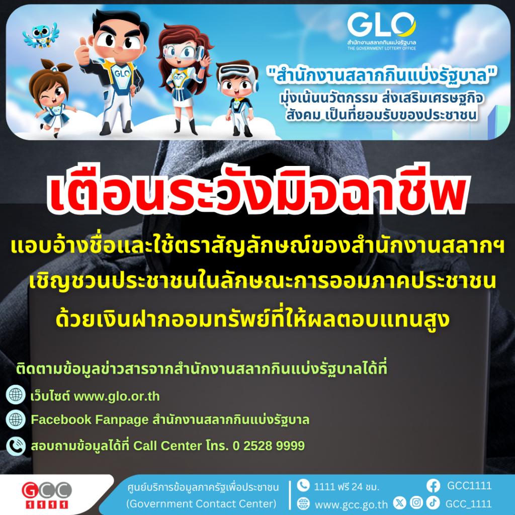สำนักงานสลากกินแบ่งรัฐบาล (GLO) ขอเตือนประชาชน อย่าหลงเชื่อ ตามที่สื่อสังคมออนไลน์ต่าง ๆ มีการแอบอ้างชื่อและใช้ตราสัญลักษณ์ของสำนักงานสลากฯ เชิญชวนประชาชนในลักษณะการออมภาคประชาชน ด้วยเงินฝากออมทรัพย์ ที่ให้ผลตอบแทนสูง