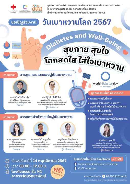 โรงพยาบาลจุฬาลงกรณ์ สภากาชาดไทย เชิญร่วมงานวันเบาหวานโลก 2567 Diabetes and Well – Being วันที่ 14 พฤศจิกายน 2567 เวลา 08.00 – 12.00 น. ณ โถงกิจกรรม ชั้น M1 อาคารรัตนวิทยาพัฒน์ หรือรับชมออนไลน์ผ่าน Facebook Live : โรงพยาบาลจุฬาลงกรณ์ สภากาชาดไทย และ CUEZ endocrine