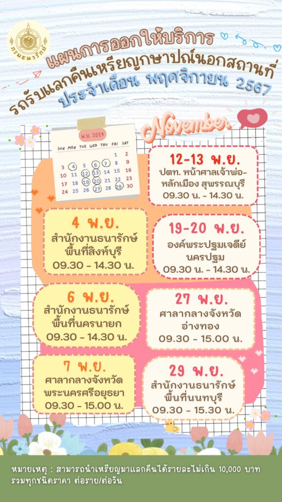 กรมธนารักษ์ จัดรถรับแลกคืนเหรียญกษาปณ์เคลื่อนที่ออกให้บริการ เดือนพฤศจิกายน 2567