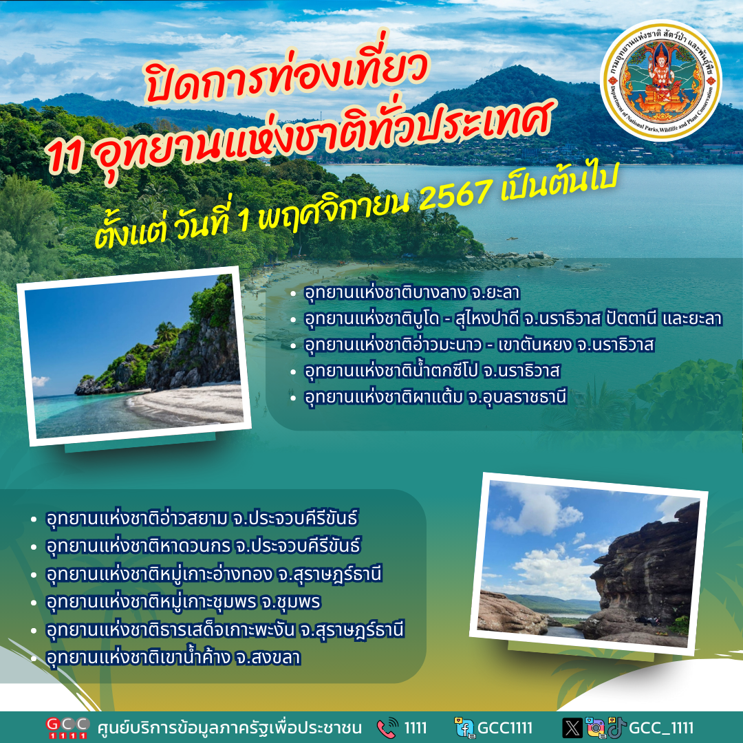 กรมอุทยานแห่งชาติ สัตว์ป่า และพันธุ์พืช ได้ออกประกาศปิดการท่องเที่ยวและพักแรม ประจำปี 2567 ในอุทยานแห่งชาติ 11 แห่งทั่วประเทศ เริ่มตั้งแต่วันที่ 1 พฤศจิกายน 2567 เป็นต้นไป โดยมีระยะเวลาปิดแตกต่างกันไปในแต่ละพื้นที่