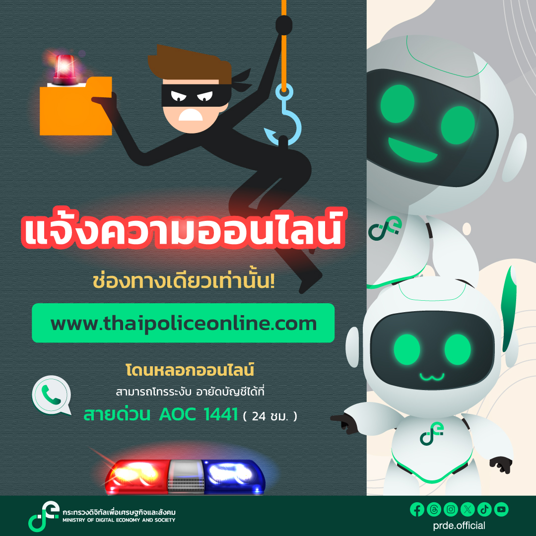 กระทรวงดิจิทัลเพื่อเศรษฐกิจและสังคม แนะนำแจ้งความออนไลน์ มีเพียงช่องทางเดียวเท่านั้น ทางเว็บไซต์ : www.thaipoliceonline.com หากโดนหลอกออนไลน์ สามารถโทรระงับอายัดบัญชีได้ที่ สายด่วน AOC 1441 ตลอด 24 ชม.