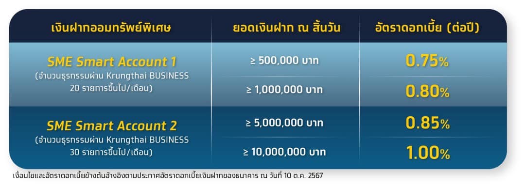ธนาคารกรุงไทย ออกเงินฝากออมทรัพย์พิเศษ SME Smart Account เอาใจลูกค้าธุรกิจ ดอกเบี้ยสูงสุด 1% ต่อปี สำหรับลูกค้าธุรกิจที่มียอดเงินฝากออมทรัพย์และใช้บริการ Krungthai BUSINESS แพ็กเกจ SME Plus หรือแพ็กเกจ SME Super Smart โดยทำธุรกรรมตามเงื่อนไขที่ธนาคารกำหนด ตั้งแต่บัดนี้ – 31 ธันวาคม 2567