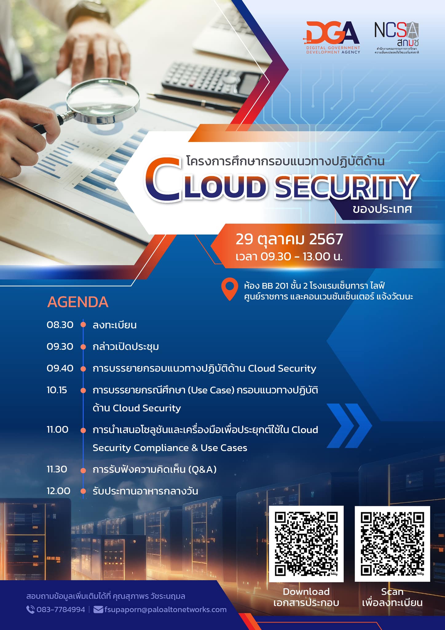 สำนักงานคณะกรรมการการรักษาความมั่นคงปลอดภัยไซเบอร์แห่งชาติ จัดโครงการศึกษากรอบแนวทางปฏิบัติด้าน Cloud Security ของประเทศ วันที่ 29 ตุลาคม 2567 เวลา 09.30 – 13.00 น. ณ ห้อง BB 201 ชั้น 2 โรงแรมเซ็นทารา ไลฟ์ ศูนย์ราชการ และคอนแวนชันเซ็นเตอร์ แจ้งวัฒนะ