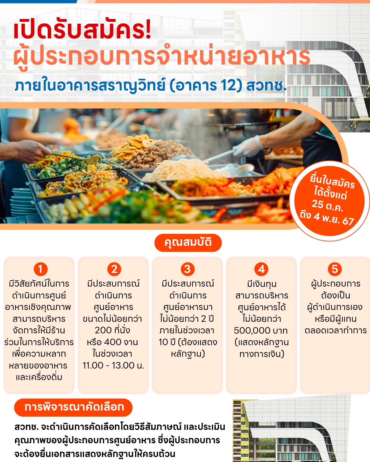 สำนักงานพัฒนาวิทยาศาสตร์และเทคโนโลยีแห่งชาติ เปิดรับสมัครผู้ประกอบการร้านอาหาร ประจำอาคารสราญวิทย์ (อาคาร 12) สวทช.