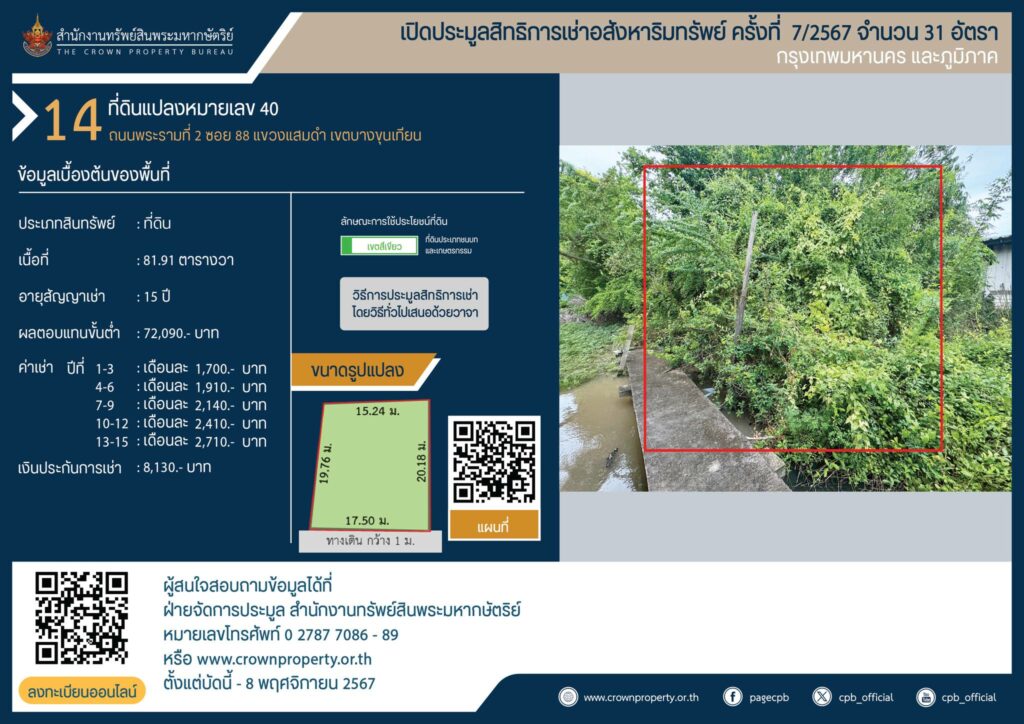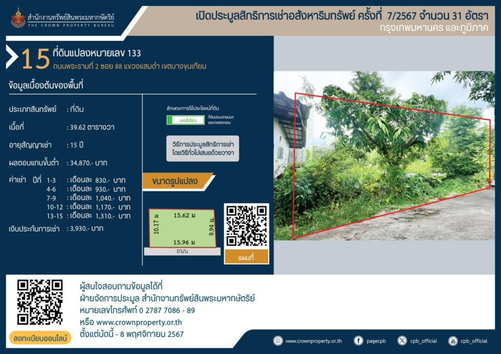 สำนักงานทรัพย์สินพระมหากษัตริย์ เปิดประมูลสิทธิการเช่าอสังหาริมทรัพย์ ครั้งที่ 7/67 บางขุนเทียน กทม. 3 อัตรา
