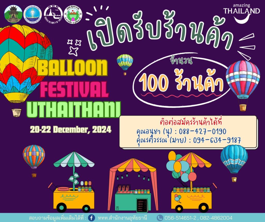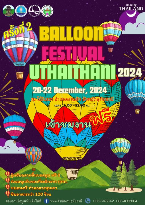การท่องเที่ยวแห่งประเทศไทย สำนักงานอุทัยธานี เชิญร่วมงาน Balloon Festival Uthaithani 2024 ครั้งที่ 2 ระหว่างวันที่ 20 – 22 ธันวาคม 2567 เวลา 16.00 – 22.00 น. ณ ไร่ริมเขา อำเภอลานสัก จังหวัดอุทัยธานี ลุ้นจับฉลาก ขึ้นบอลลูนฟรี และของที่ระลึกสุด limited จาก ททท.สำนักงานอุทัยธานี และเปิดรับสมัครร้านค้า จำนวน 100 ร้านค้า