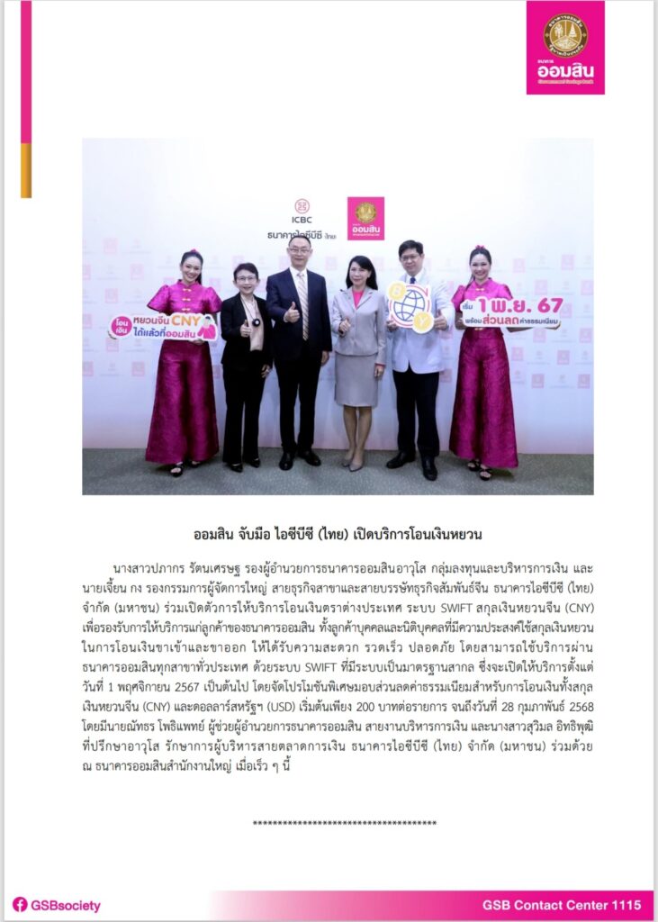 นางสาวปภากร รัตนเศรษฐ รองผู้อำนวยการธนาคารออมสินอาวุโส กลุ่มลงทุนและบริหารการเงิน และนายเจี้ยน กง รองกรรมการผู้จัดการใหญ่ สายธุรกิจสาขาและสายบรรษัทธุรกิจสัมพันธ์จีน ธนาคารไอซีบีซี (ไทย) จำกัด (มหาชน) ร่วมเปิดตัวการให้บริการโอนเงินตราต่างประเทศ ระบบ SWIFT สกุลเงินหยวนจีน (CNY) เพื่อรองรับการให้บริการแก่ลูกค้าของธนาคารออมสิน ทั้งลูกค้าบุคคลและนิติบุคคลที่มีความประสงค์ใช้สกุลเงินหยวนในการโอนเงินขาเข้าและขาออก ให้ได้รับความสะดวก รวดเร็ว ปลอดภัย โดยสามารถใช้บริการผ่านธนาคารออมสินทุกสาขาทั่วประเทศ ด้วยระบบ SWIFT ที่มีระบบเป็นมาตรฐานสากล ซึ่งจะเปิดให้บริการตั้งแต่วันที่ 1 พฤศจิกายน 2567 เป็นต้นไป โดยจัดโปรโมชันพิเศษมอบส่วนลดค่าธรรมเนียมสำหรับการโอนเงินทั้งสกุลเงินหยวนจีน (CNY) และดอลลาร์สหรัฐฯ (USD) เริ่มต้นเพียง 200 บาทต่อรายการ จนถึงวันที่ 28 กุมภาพันธ์ 2568 โดยมีนายณัทธร โพธิแพทย์ ผู้ช่วยผู้อำนวยการธนาคารออมสิน สายงานบริหารการเงิน และนางสาวสุวิมล อิทธิพุฒิ ที่ปรึกษาอาวุโส รักษาการผู้บริหารสายตลาดการเงิน ธนาคารไอซีบีซี (ไทย) จำกัด (มหาชน) ร่วมด้วย ณ ธนาคารออมสินสำนักงานใหญ่